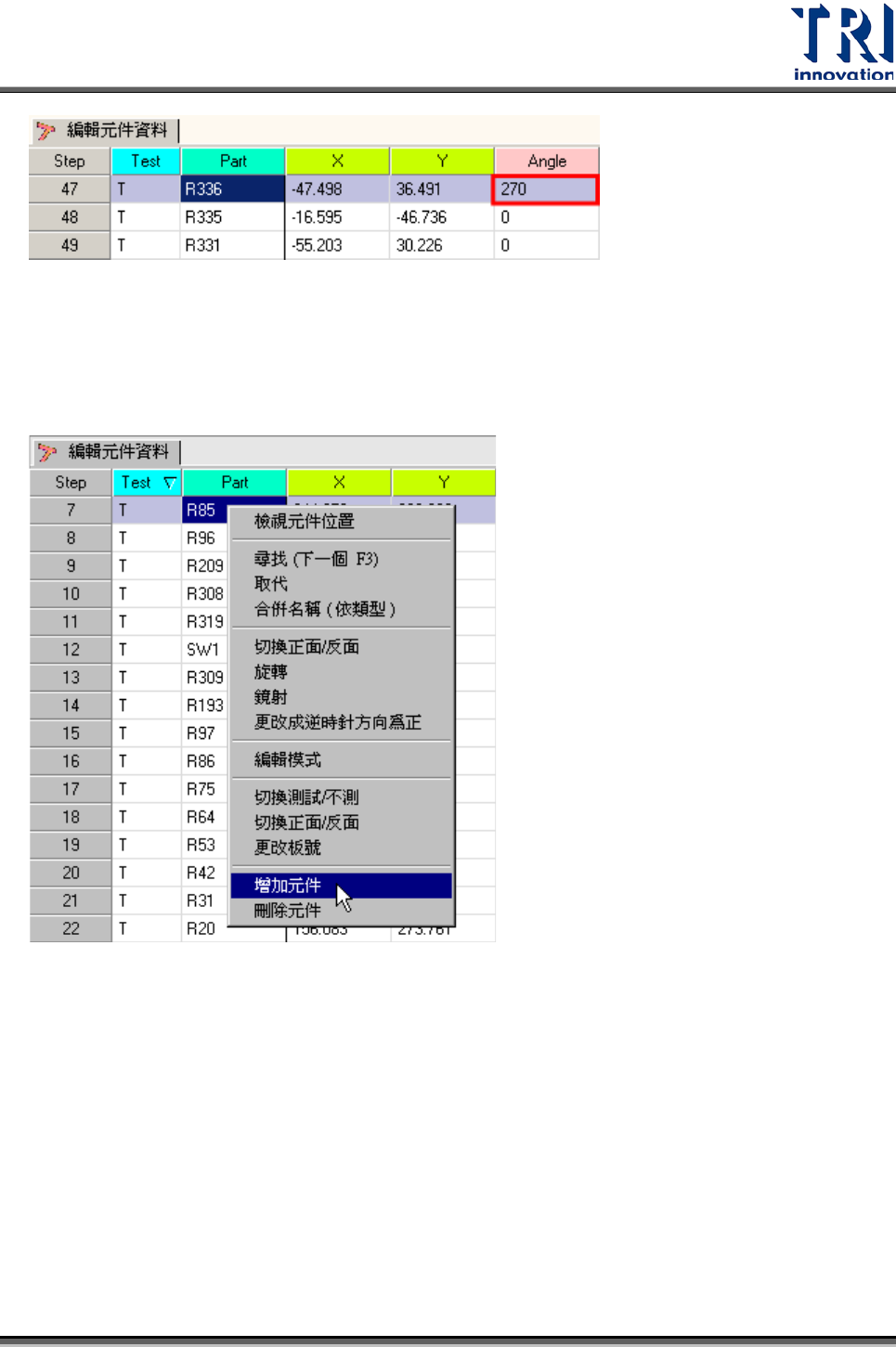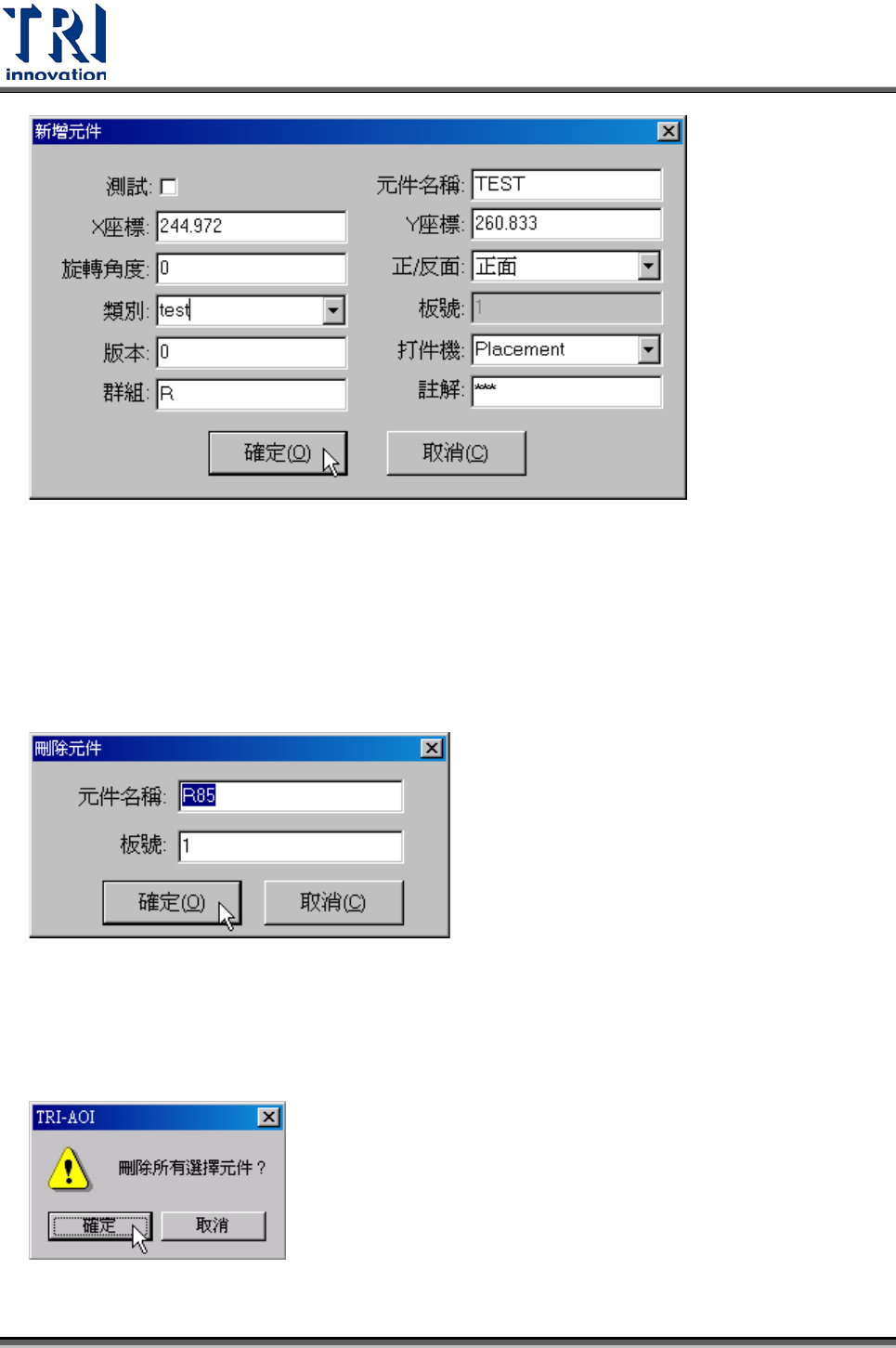 Test Research Inc. 310 TR 7700 S II DL Us er Gui de – Software 4.2.15 增加元件 可使用此功能增加新元件資料至本片電路板上。 選擇上述 [ 增加元件 ] 功能後,會出現以下 [ 新增元件 ] 視窗,將視窗內的資料填妥後按下 [ 確定 ] ,即可新增一個元件。