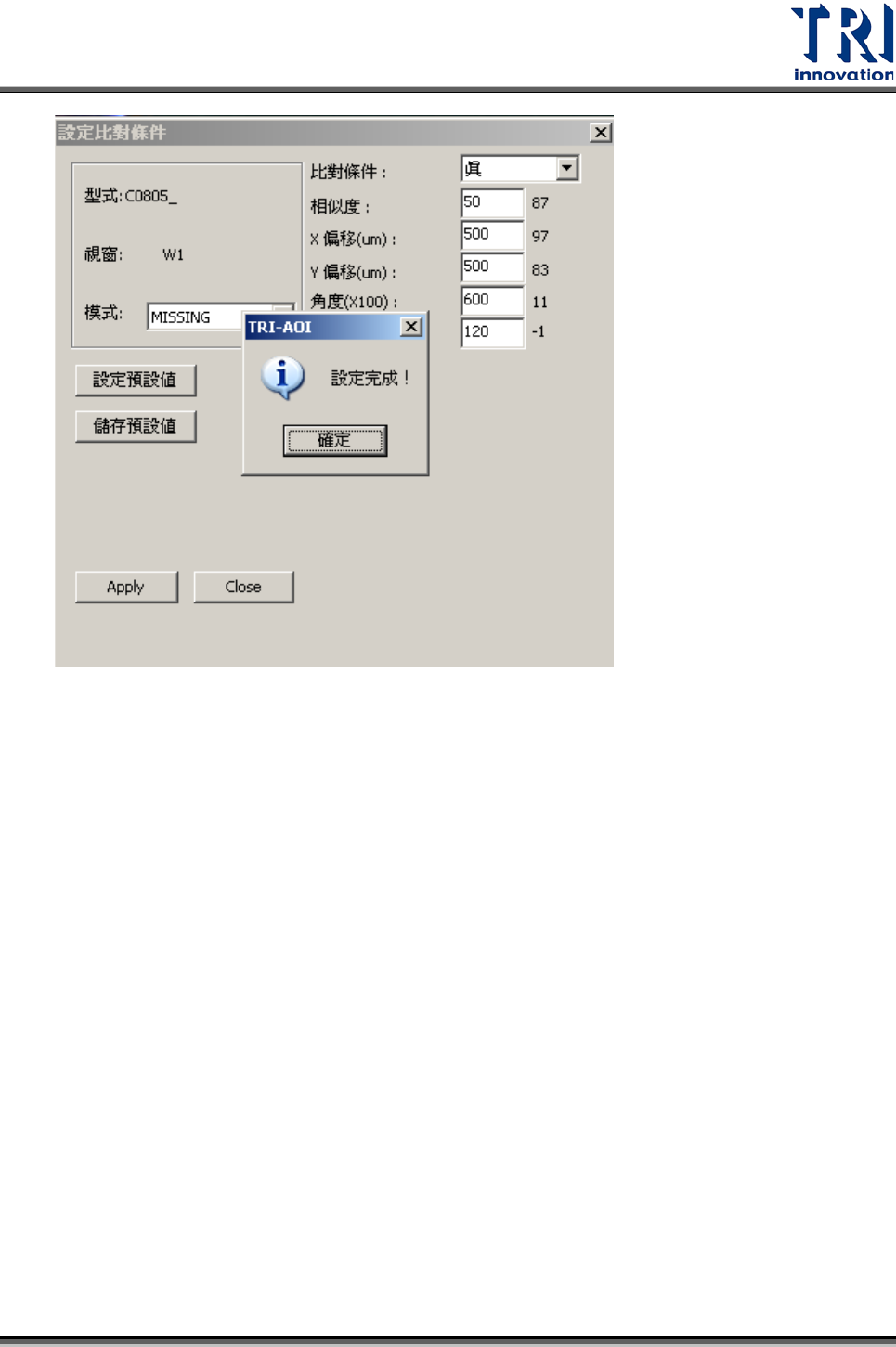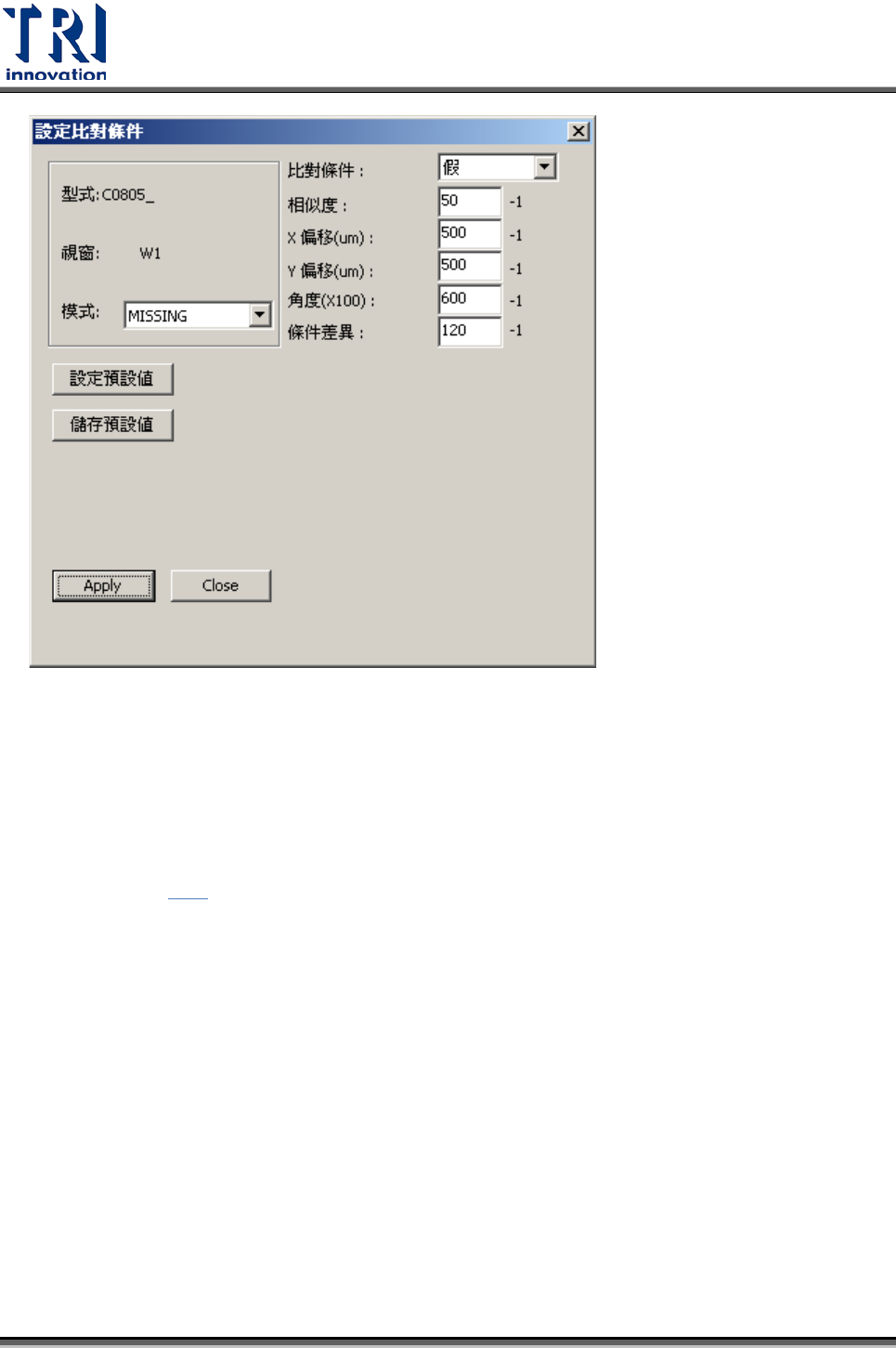 Test Research Inc. TR 7700 S II DL Us er Gui de – Software 389 型式 :顯示目前設定的元件類型。 視窗 :顯示目前正在設定的檢測框名稱。若選擇多個檢測框則會顯示 [========] 。 模式 :顯示目前選擇 檢測框 的檢測方式。一次僅能對於一個檢測框作設定。。 參數設定區 :根據不同檢測方式的檢測框,會有不同的參數需要設定。參數設定的詳 細說明請參閱 4.10 。 設定預設…