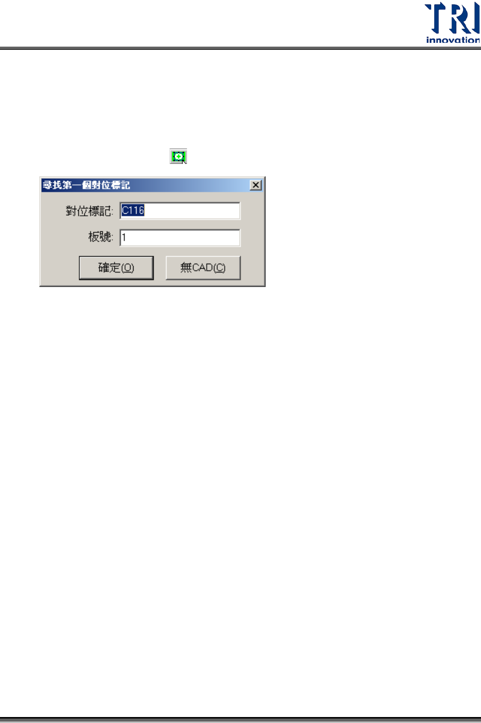 Test Research Inc. 28 TR 7700 S II DL Us er Gui de – Software 2.5 學習對位 標記 2.5.1 學習對位標記 學習對位標記以作為每片待測板位置的標準。 1. 按下 [ 定位對位標記 ] 按鈕 ( ) 後,會跳出以下視窗。 2. 首先尋找第一個對位標記 (Fiduc ial0) 。若對位標記點有座標列在 CAD 中,則可直 接輸入其元件名稱,接著按 [ 確定 ] ,若對位標記…