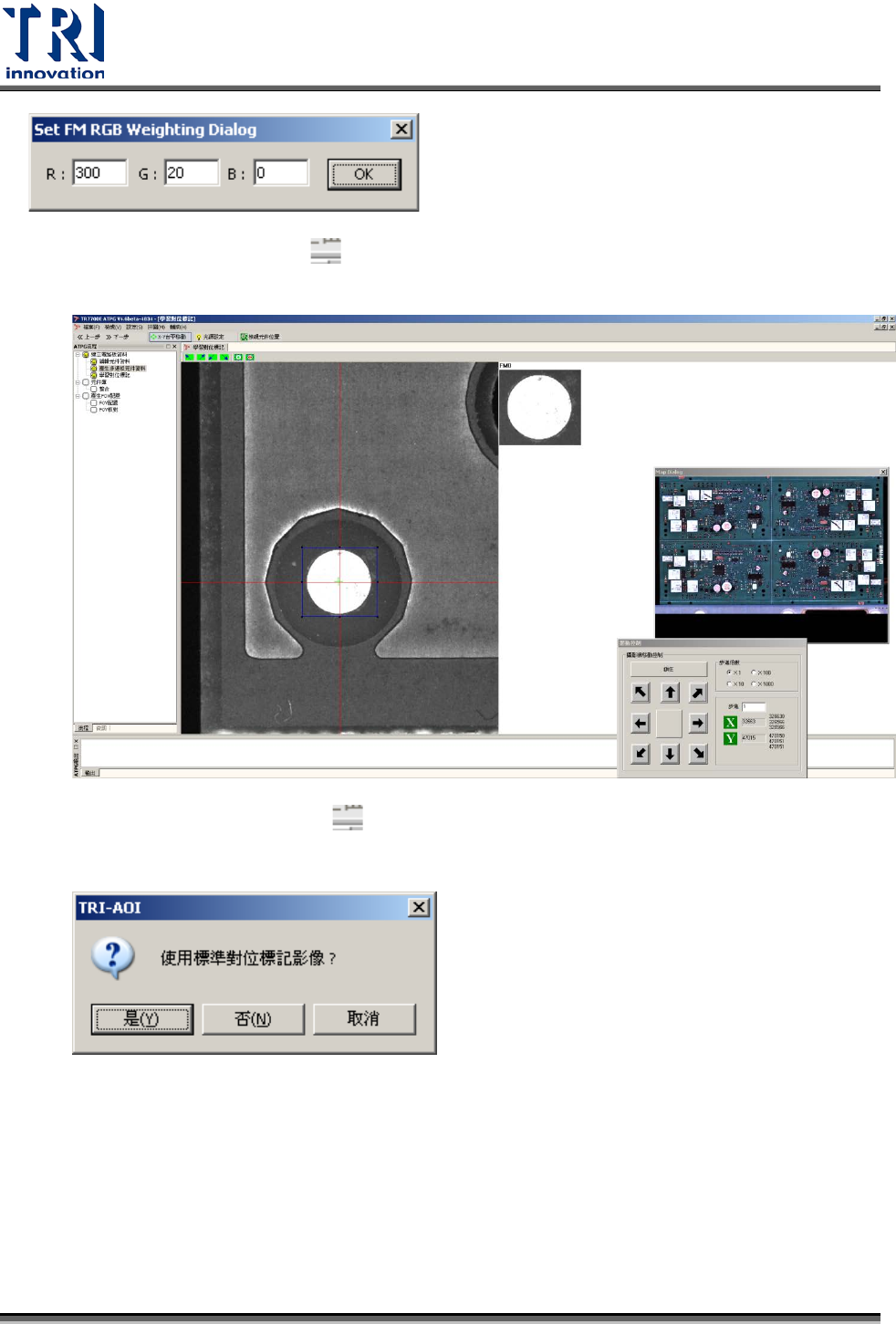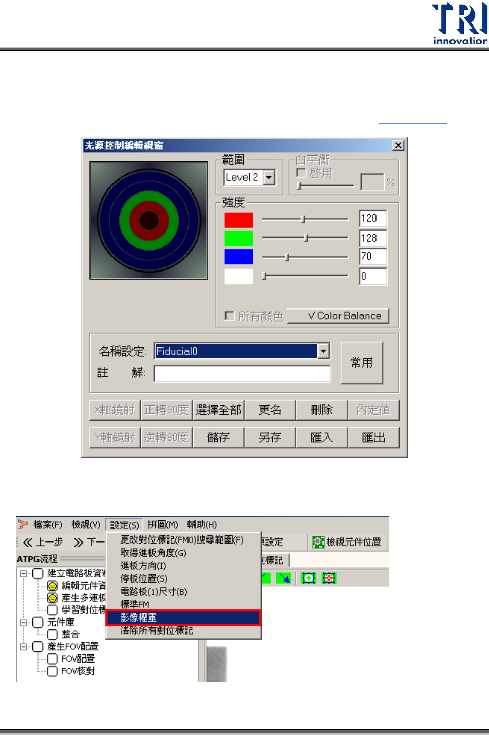 Test Research Inc. 30 TR 7700 S II DL Us er Gui de – Software 3. 若目前的燈光無法看清定位標記的形狀,可按下 [ 光源設定 ] 按鈕。按下後,會出現 [ 光源控制編輯視窗 ] 。選擇名稱為 [Fiducial 0] 的燈光後進行燈光強度的調整,直到 合適當前定位標記後,按下 [ 儲存 ] 按鈕。詳細的設定方式請參閱 4.8 光源設定 。 4. 另外,也可以選擇 [ 設定 ]…