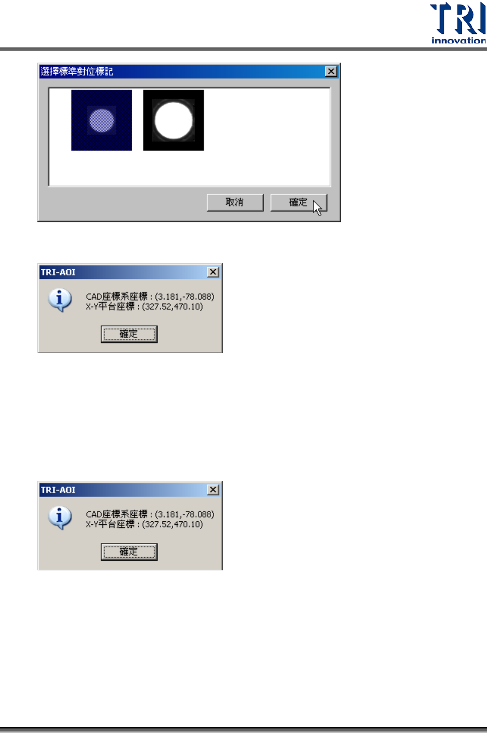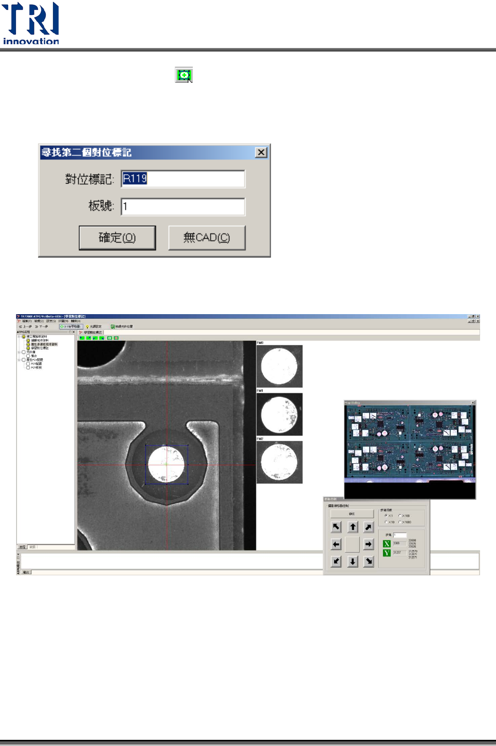 Test Research Inc. TR 7700 S II DL Us er Gui de – Software 33 7. 按下 [ 定位對位標記 ] 按鈕 ( ) ,設定第二對位標記點 8. 輸入第二個對位標記點的名稱以及所在的板號,按 [ 確定 ] 。或按下 [ 無 CAD] 使用手 動尋找定位標記位置。 9. 同設定第一對位標記的方式去擷取第二與第三對位標記點。完成後,會如下圖所 示,影像右方會有三顆對位標記點的縮圖。