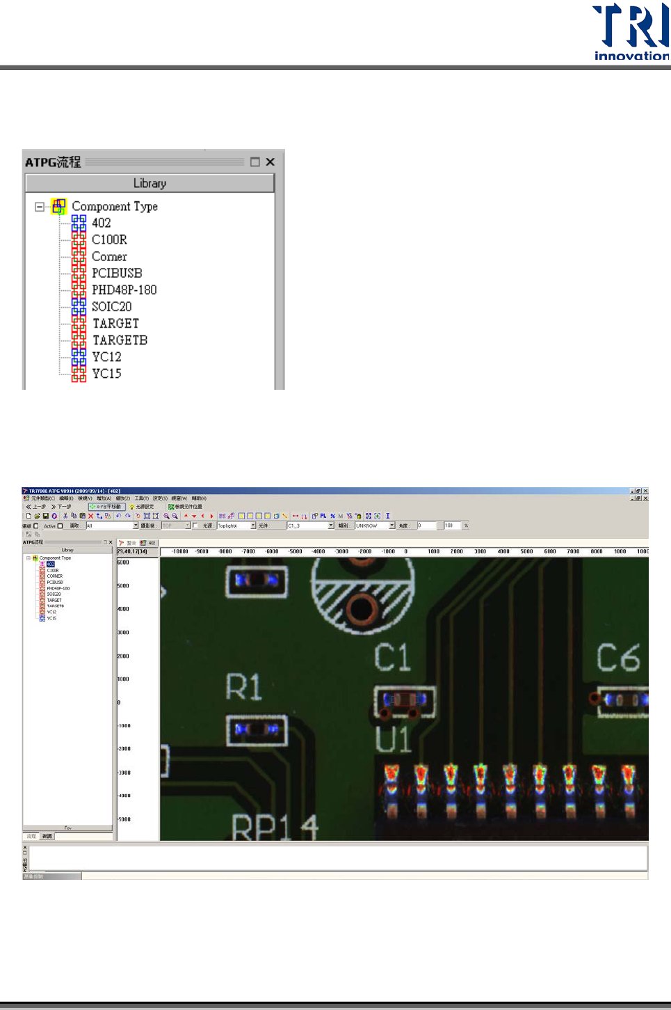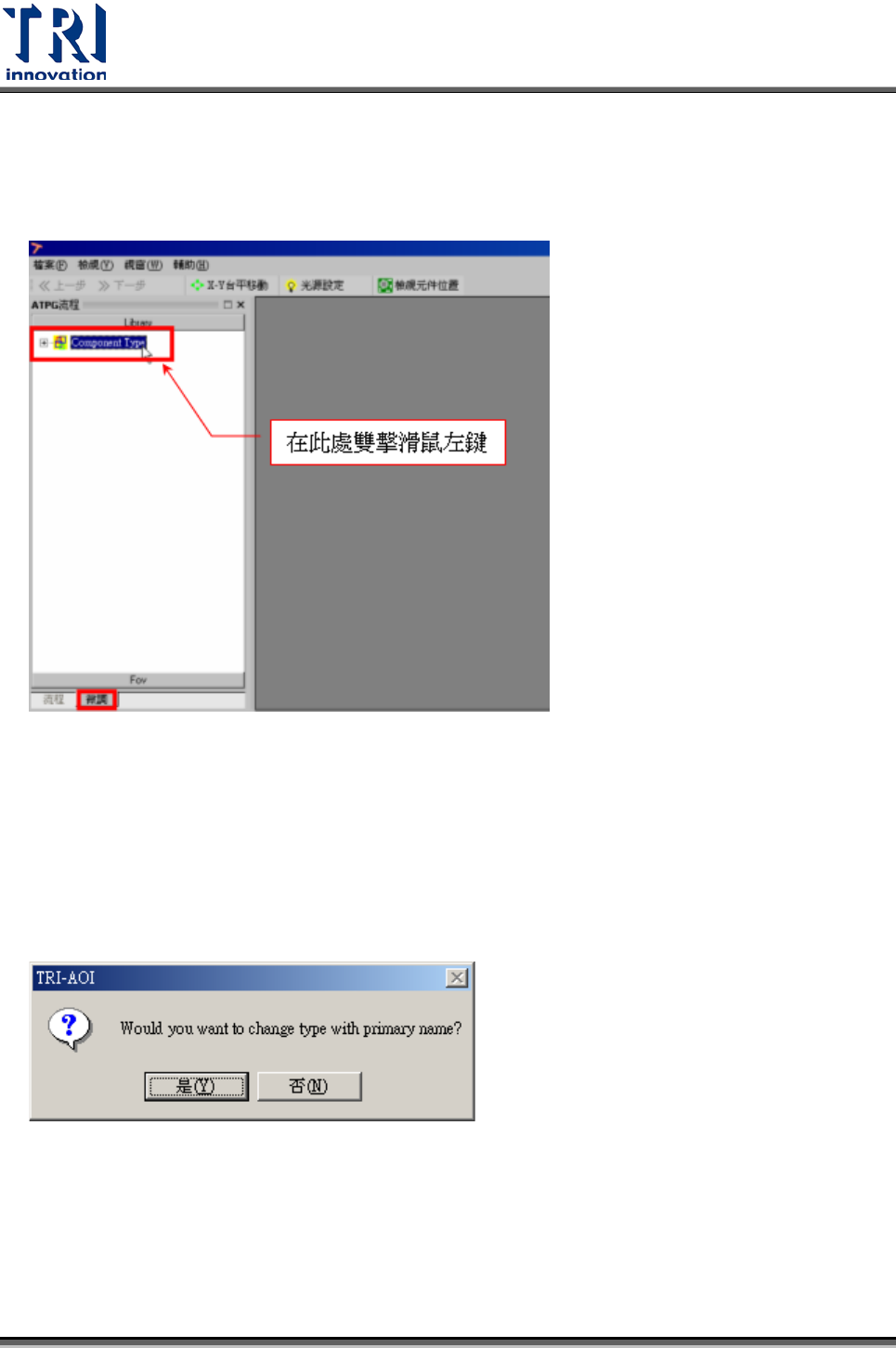 Test Research Inc. TR 7700 S II DL Us er Gui de – Software 35 1. 在 [ATPG 流程 ] 欄位之左下方,選擇 [ 微調 ] 頁籤,接著點選 [Librar y] 。在 [Compon ent Type] 列表 上按兩下,此時攝影機會先尋找對位標記點,接著即列出 所有類型的元件列表。 2. 進入 ATPG/Libr ary 會詢問是否更改 Type 名稱至 primary …
