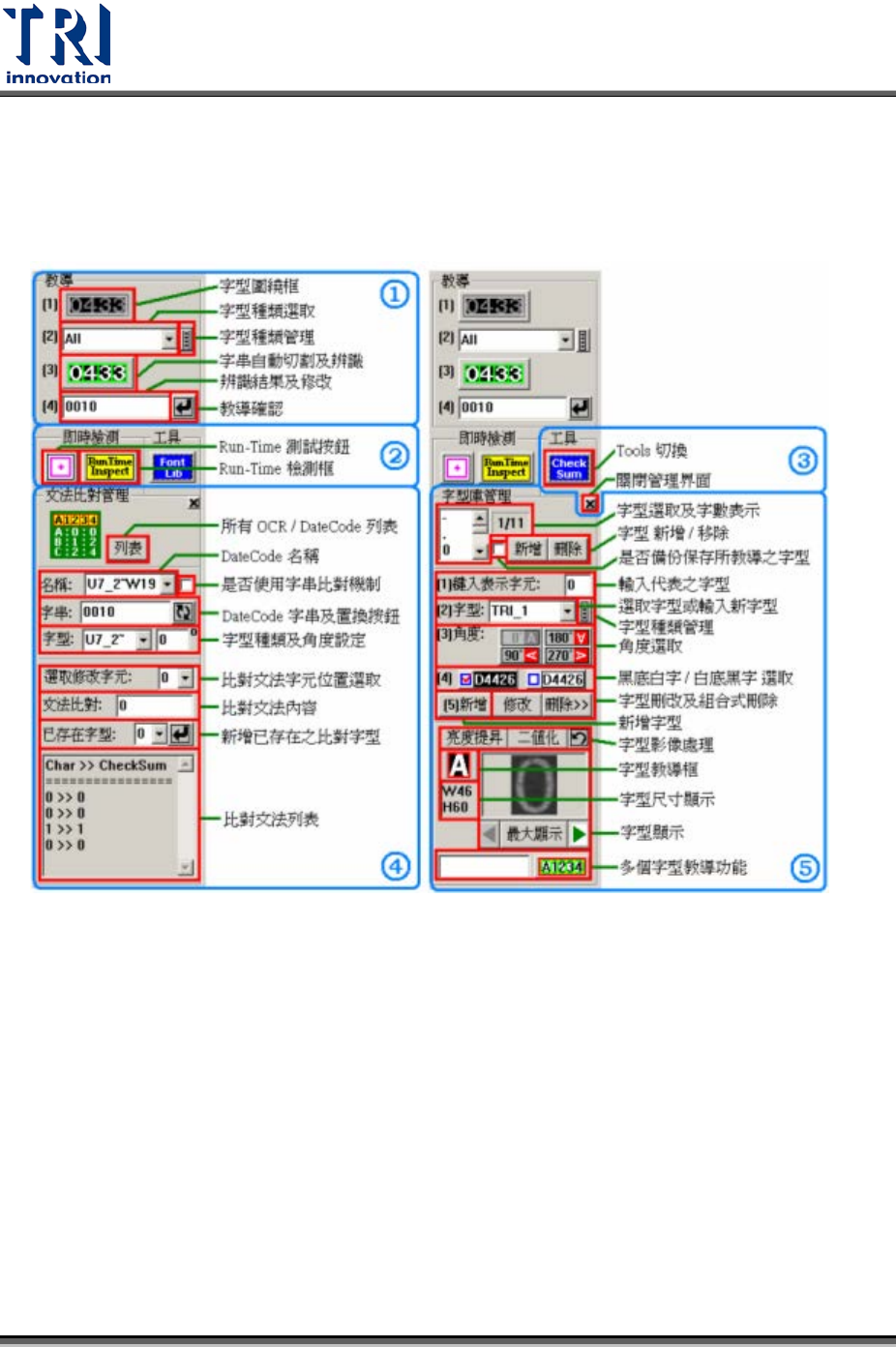 Test Research Inc. 662 TR 7700 S II DL Us er Gui de – Software 1. 字串圍繞框 : 框選欲辨識的字串,進入 Manual Tr ain 時,系統將自動 啟動此功能,框選時請以「緊密圍繞」的方式框住字串,以利字串自動切割及 辨識。 2. 字型種類選取 : 利用字型種類管理或字型下拉式功能表來指定字型種類、 或選擇「 All 」以自動判定所屬之字型種類。可利用字型種類管理按鍵來…