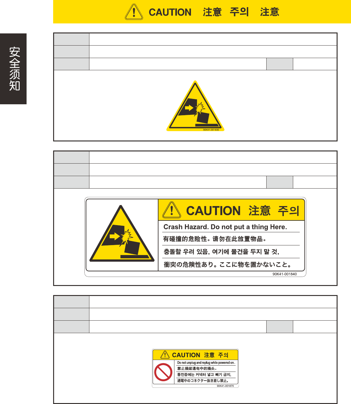 xxv 危险结果 可能会导致设备被损坏 ( 与贴装头发生碰撞等 )。 安全防范 确认一次性换料车的盖板上是否放置有物品。 对象 一次性换料车 (YSM40) 警告阶段 生产准备 危险结果 载带与贴装头接触,可能会导致设备被损坏。 安全防范 从送料器安装位置拔出送料器时,必须完全拔出后再插回。 对象 YSM10、Z:LEX(YSM20/YSM20W)、YSM40/YSM40R 警告阶段 生产准备 危险结果 直接在元件补充台上补充元件,可能…