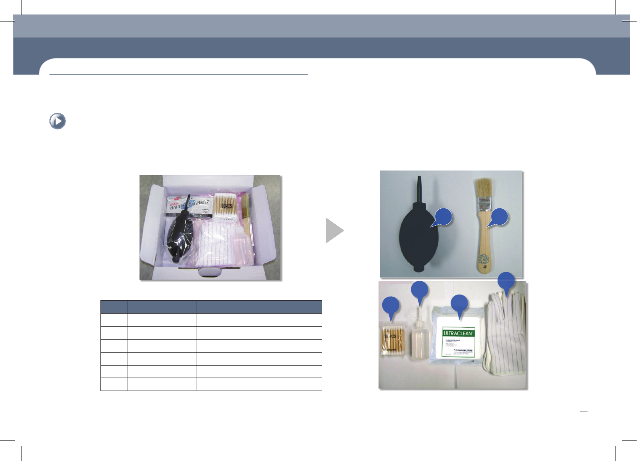 - 본 장비를 유지보수하기 위해서 필요한 도구인 Cleaning Kit가 장비와 함께 제공됩니다. 여기선 Cleaning Kit를 구성하는 구성물과 용도를 기술합니다.