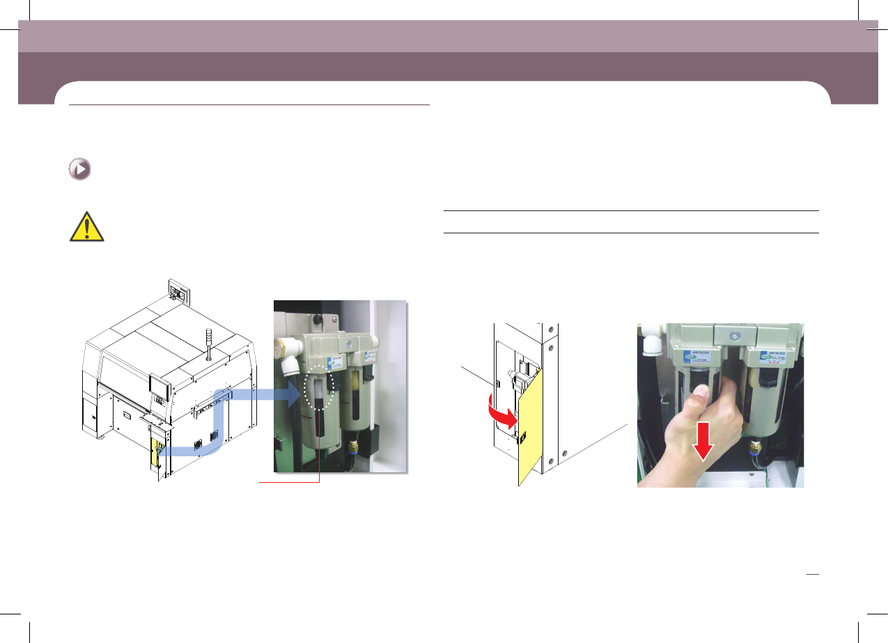SM471 M aintenance Handbook 34 Cha pter 3 Fas t & Fl ex ibl e Chip Sho ot er Air Filter 변색확인 Rear Front 일일 점검 공기 속의 먼지를 제거함으로써 공압 사용 시 이물질로 인한 장비 오류를 방지 1. OP패널의 ‘EMG’ 버튼을 눌러서 작업을 정지 후 ‘ST OP’, ‘RESET’ 버튼을 차례대로 누르기. …