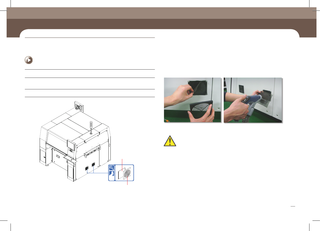 SM471 M aintenance Handbook 40 Cha pter 4 Fas t & Fl ex ibl e Chip Sho ot er Cooling Fan Filter Cooling Fan Filter Cover ① Cooling Fan Cover 분리 ② 진공청소기로 청소 주간 점검 진공청소기 3. “비상정지 해제하기(Page 14)”를 참조하여 비상정지 해제하여 작업을 재진행 …