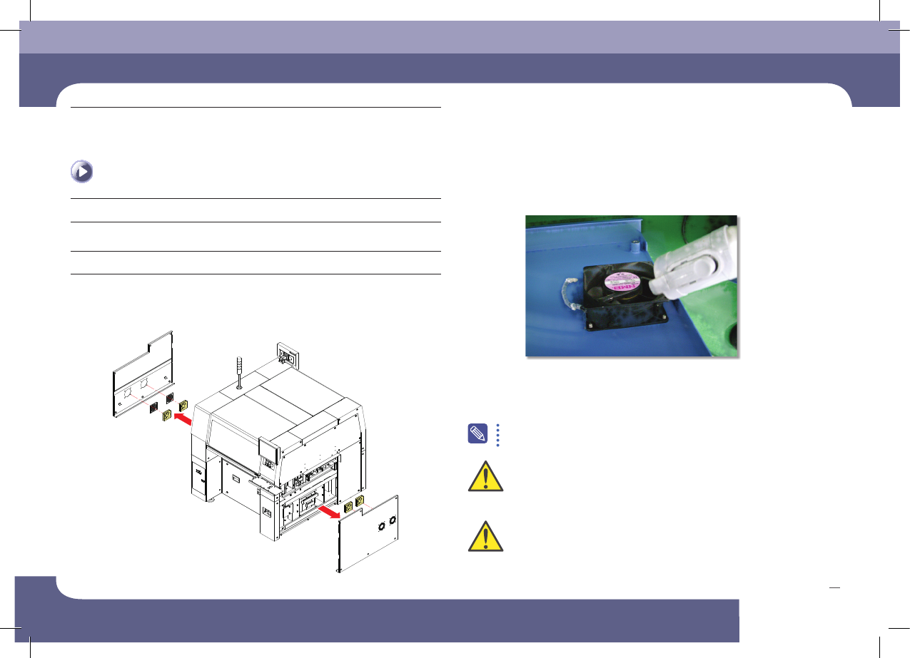 SM471 M aintenance Handbook 52 Cha pter 5 Fas t & Fl ex ibl e Chip Sho ot er - Cooling Fan Cover 분리 - Cooling Fan Fan Filter 교환 - 진공청소기로 청소 월간 점검 진공청소기 Cover Cooling F an Filter 교환 유 지보 수 도 구 조치 1. 다음 그림 순서대로 분리하여 Fi…