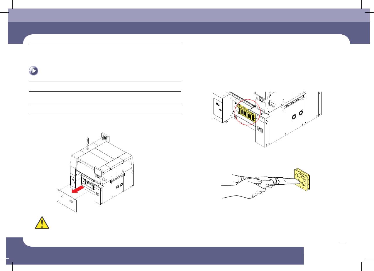 SM471 M aintenance Handbook 54 Cha pter 5 Fas t & Fl ex ibl e Chip Sho ot er 월간 점검 4. 청소 후 Main Switc h를 On 이상 소음 및 동작 이상을 보인다면 다시 장비의 Main Switch를 OFF하고 Cooling Fan을 교환 장비의 Main Sw itch를 ON시 Cooling Fan이 작동하므로 손에 상해…
