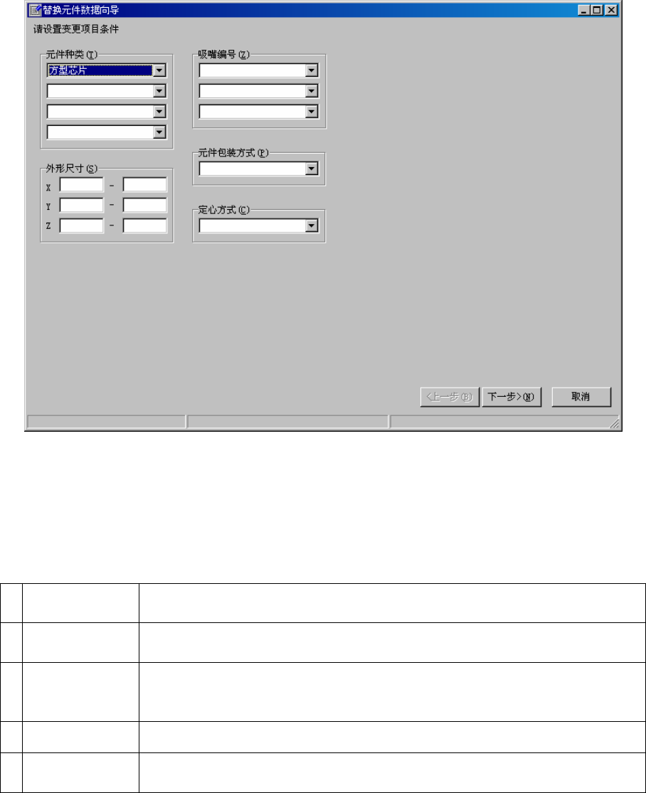 第 5 章 编辑程 序 5-102 5.6.4.10 替换 替换命令只有在元件数据的列表画面及表格画面才能执行。 从[编辑]菜单选择[替换],启动下列[替换元件数据向导] 。 图 5.6-17 替换元件数据向导 条件设置画面 在条件设置画面中,设置变更对象的元件条件。 可设置的条件见下表。 表 5.6-14 条件设置画面 设置项目 1 元件种类 最多指定四种元件种类。指定多种类时,被指定的所有元件均为对象。 不指定时,所有元件均为对象。…