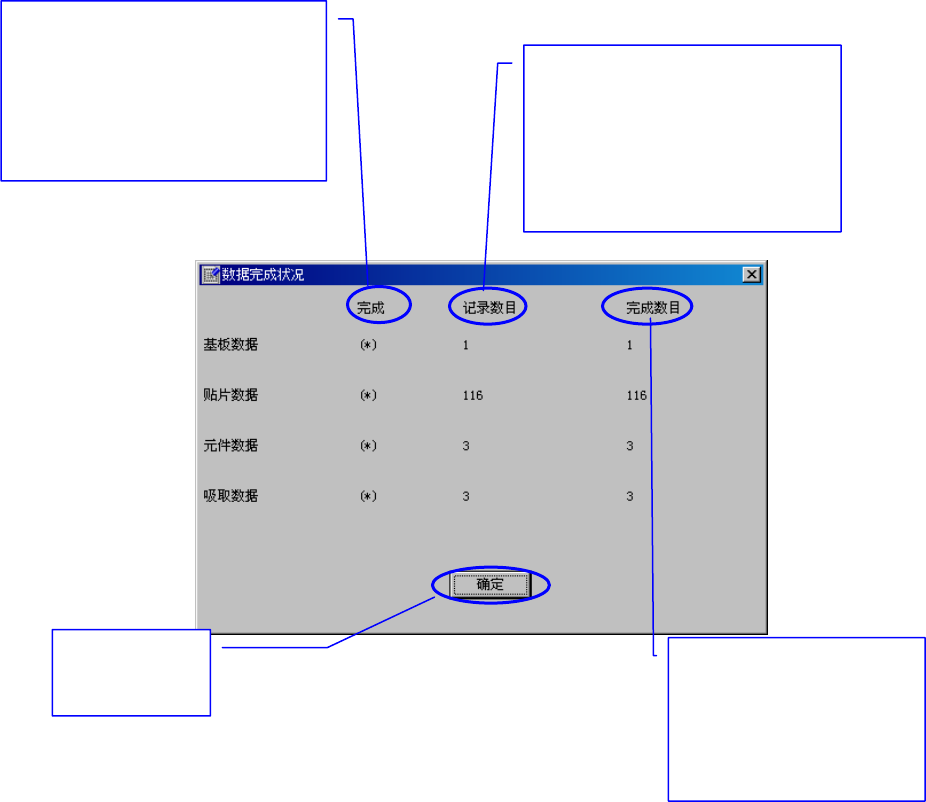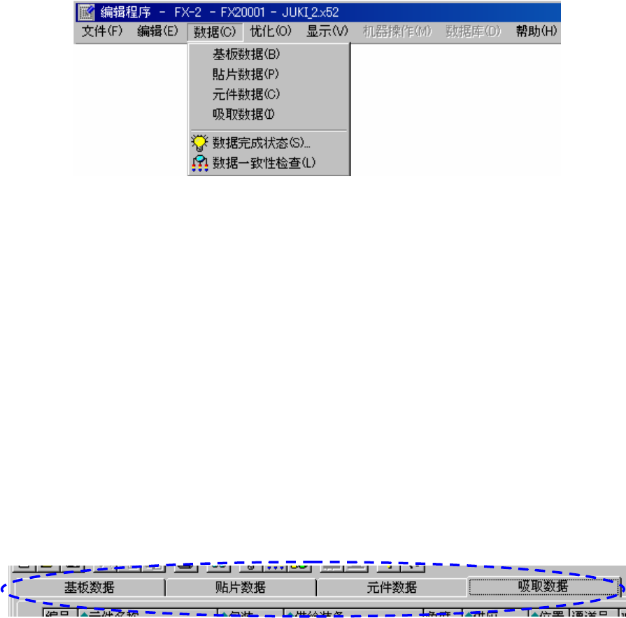 显示基板数据、贴片数据、元件数据、吸取数据间的移动和各个数据的完成状況。