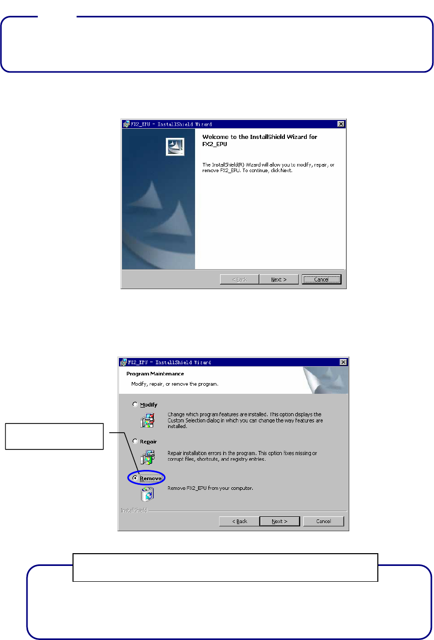 第2章 安装 2-7 2.2.4.2 用[程序的维护]功能卸载 按照这个步骤进行卸载,只适用于安装的版本和 CD 内的 EPU 版本一致时。 如果版本不一致,请按照2.2.4.1 用[添加/删除程序]卸载的步骤来卸载。 请按照和『2.1.1 启动安装程序』同样的步骤启动安装程序。 显示如下画面。 图 2.2-7 安装程序启动时的显示画面 请单击[下一步]。 出现[程序维护]对话框 ,选择删除。 图 2.2-8 程序的维护 [修改] 可以…