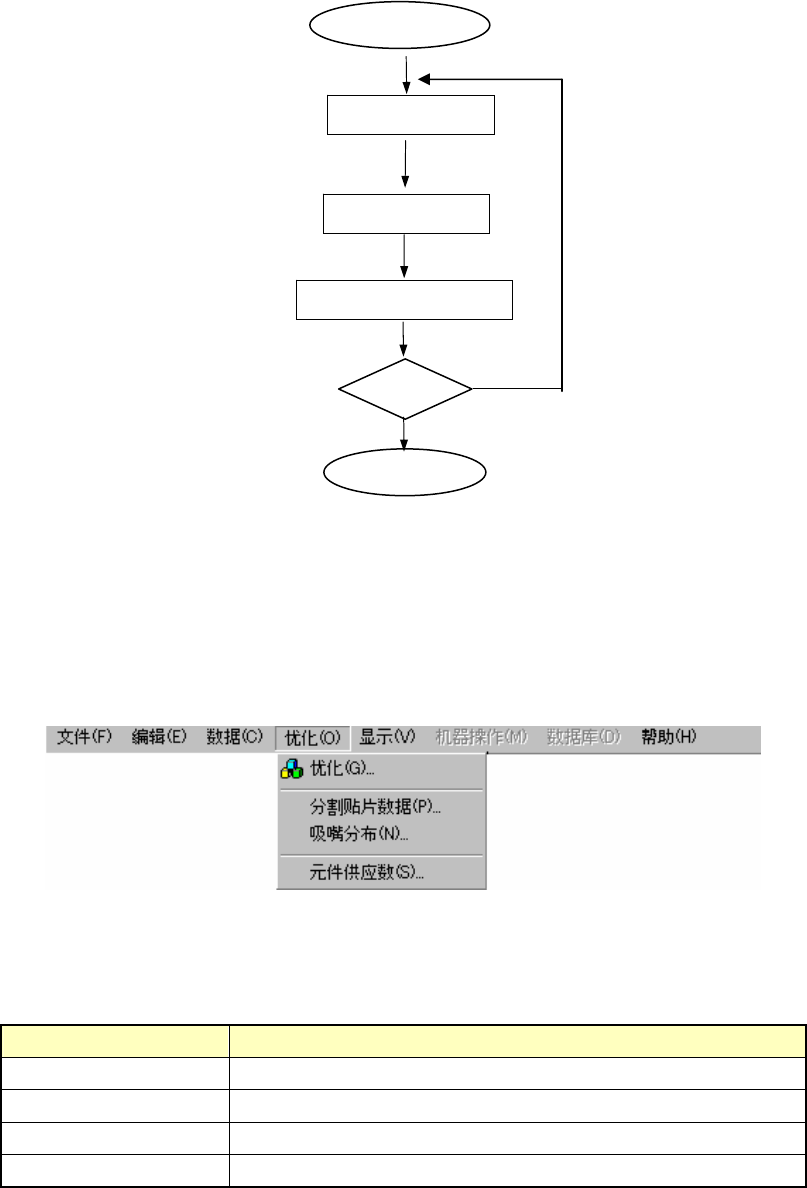 第 6 章 编辑辅助功能 6-8 (3) 优化流程 执行优化 供料器安排 变更以 下条件的同时 选择最 佳速度 吸嘴安排 1.左右平衡 2. 仅限前面 3. 后面有效 修改贴片顺序的排列 No 最佳速度 Yes 结束优化 图 6.2-1 优化流程和生产程序文件 (4) [优化] 菜单的组成 [优化]菜单由下列项目组成。 图 6.2–2 [ 优化] 菜单的组成 表 6.2–3 [ 优化] 菜单的内容 项目 内容 [优化(G)] 指定优化及…