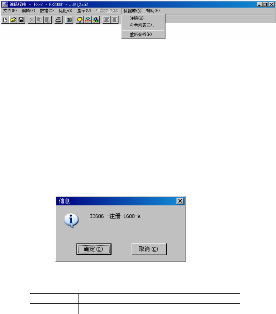 第 6 章 编辑辅助功能 6-32 6.4 数据库 把元件数据、图像数据[注册]到元件数据库里,就可以在编集程序时参照和复制。 详细用法,请参照《 Flexline 数据库说明书》 。 图 6.4-1 数据库菜单 6.4.1 注册 在编集程序中, 可以将元件数据[注册]到元件数据库。 元件数据库可实时更新[注册]的数据。 因此, [注册]之后, 这些[注册]数据可随时 「重新查找」使用。 从编集程序上[注册]到元件数据 库时,同一文件名…