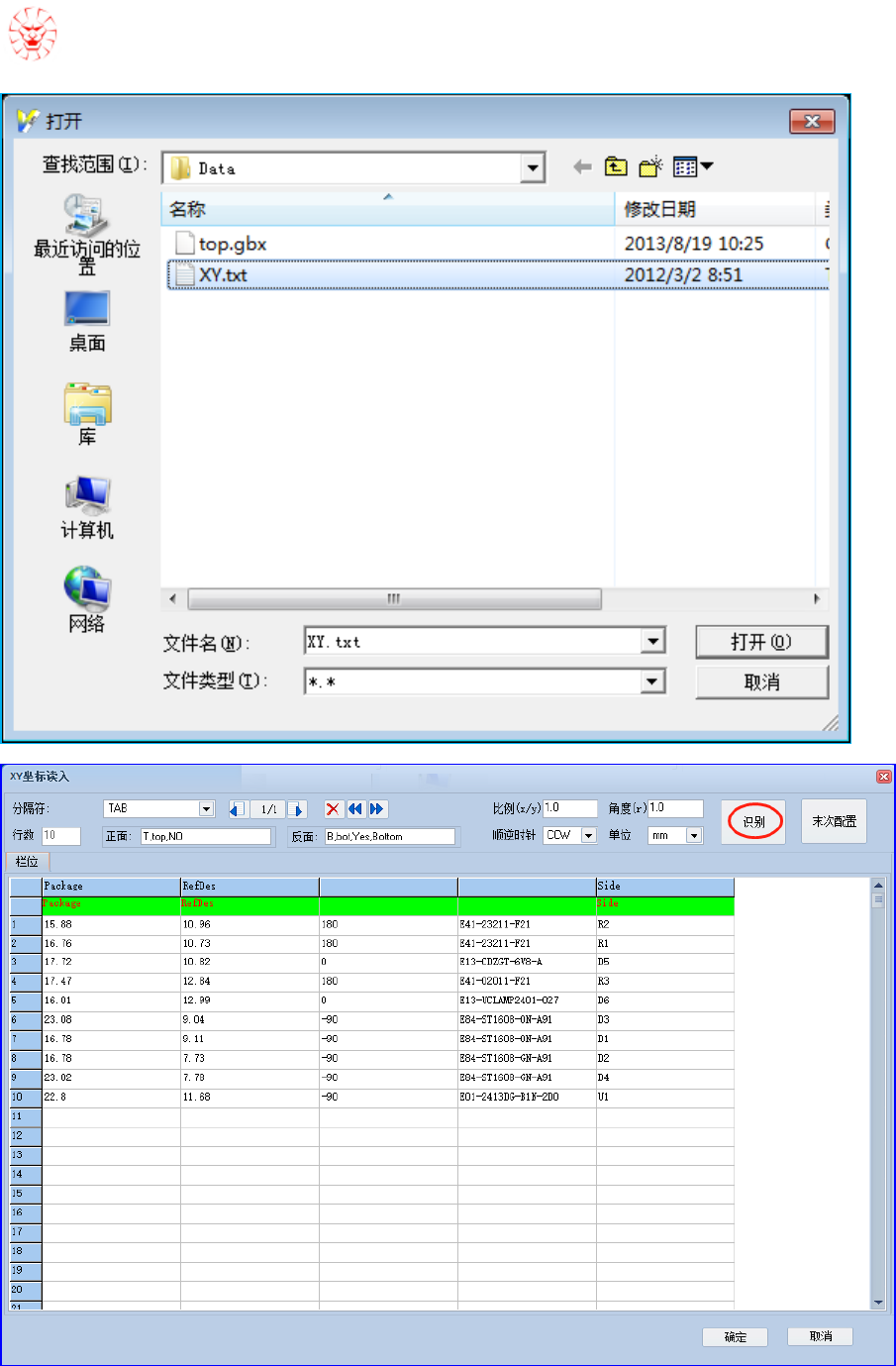 删除不需要读入的行,在分隔符号项选择 X Y坐标分割码,点击识别栏位。软件自动把位号,坐