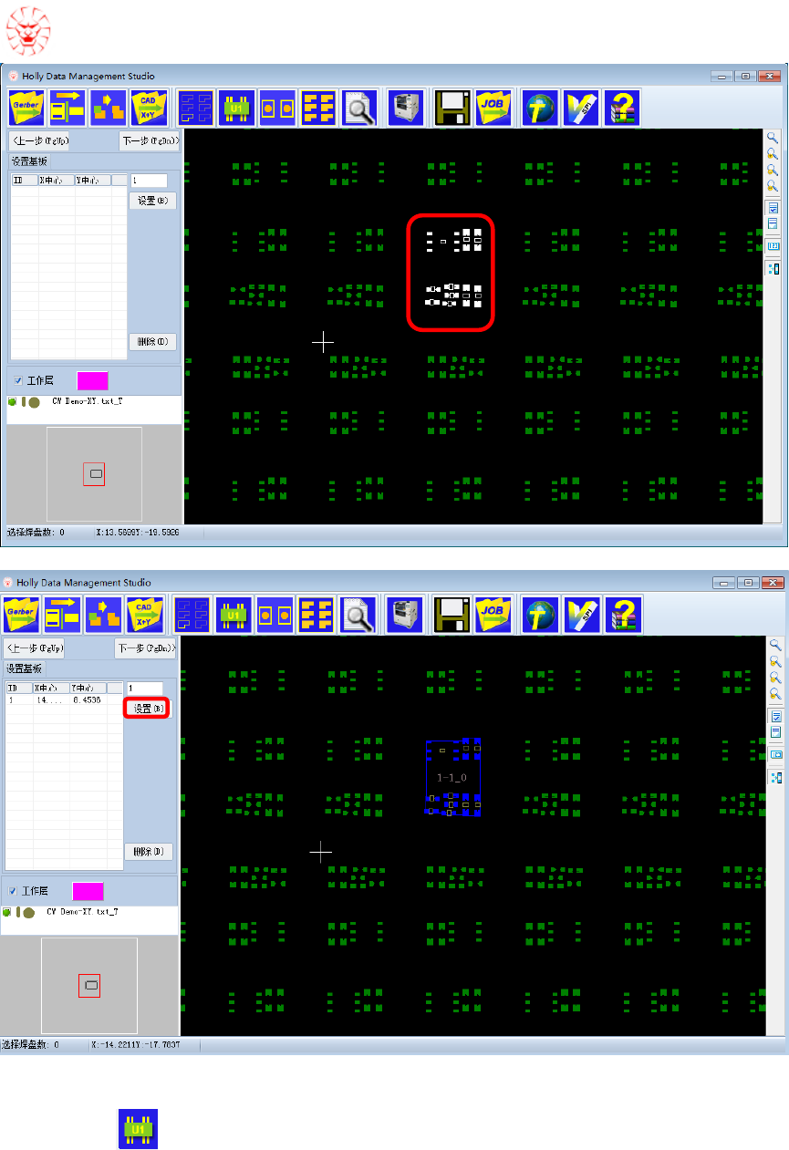 Holl y Data Managem ent Studio 13 / 26 设置小板的外框,框选 上图中红色区域,点 击 " 设置 " 完成。 1.6. 合并元件 点击下一步或 " " 进入合并元件界面, 将元件坐标和其对 应焊盘合并成相应 的元件封 装,可根据实际 情况,灵活选择合并方 式。
