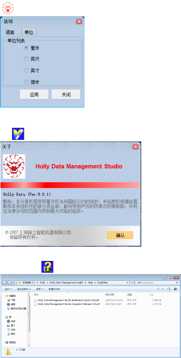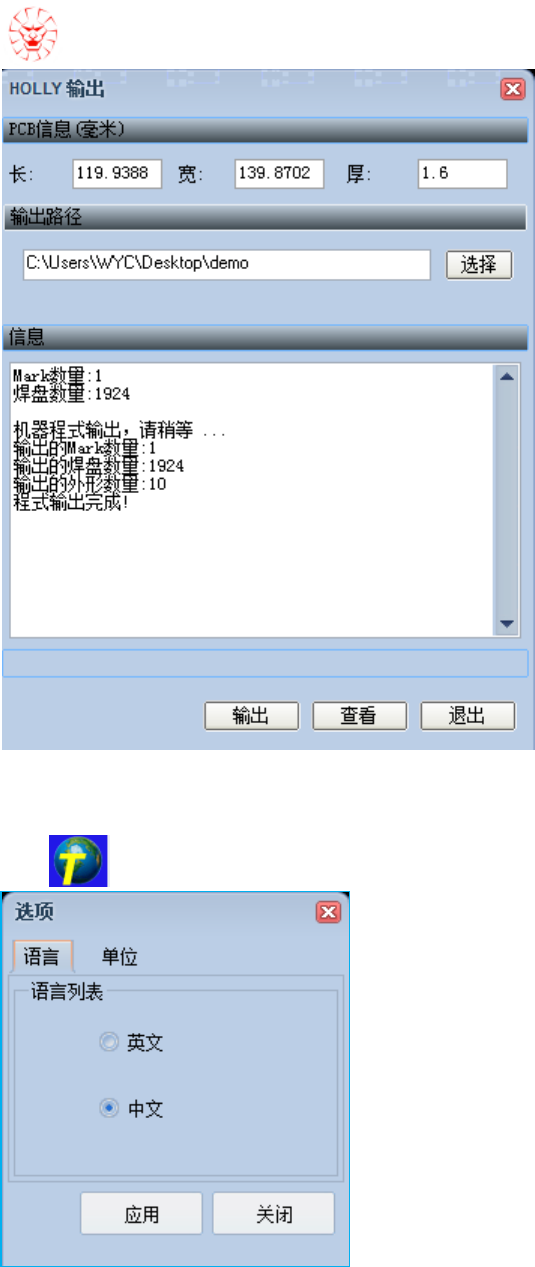 Holl y Data Managem ent Studio 25 / 26 点击 " 输出 " 完成。 1.11. 语言 点击 " " 按钮修改语言以 及单位 语言:设置中文,英文 语言