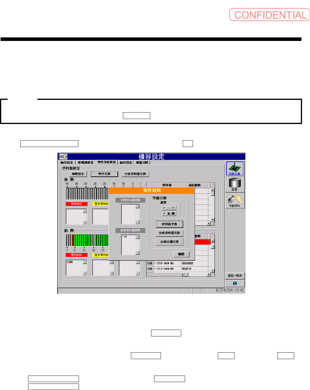 另外,有残留未交换的供料器时,对话框中以红字表示 「有未交換完成之供料器」