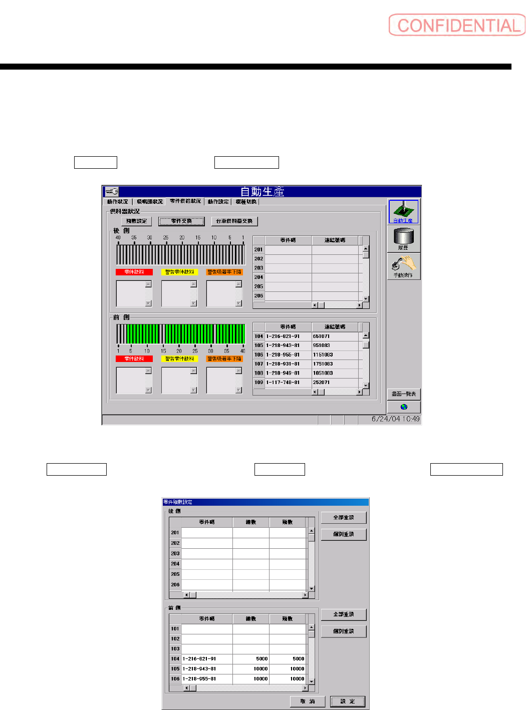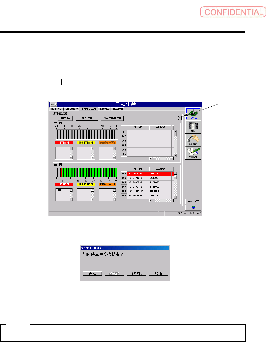自動生產 ( 自动生产 )- 零件供給狀況 ( 零件供给状况 ) 画面下,使用者层级只限于管理者以上并表示于画面右