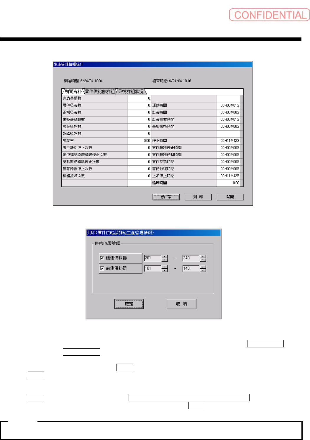 操作篇 操作篇 操作篇 操作篇 4. 自动生产 SI-F130 4-79 图 4.7. 3-3 生產管理情報 統計 ( 生产管理信 息统计 ) 对话框 默认值会出现在现在 所使用的供给部号码中。限 于特定供给部欲打印时,点 击 後側供料器 ( 后侧供料器 ) 、 前側供料 器 ( 前侧供料器 ) 欲打印的供给部复选框,指定 打印范围。 确认开启打印机的电 源后,请点击 確定 ( 确定 ) 钮。 开始打 印。 点击 取消 ( 取消 ) 钮…