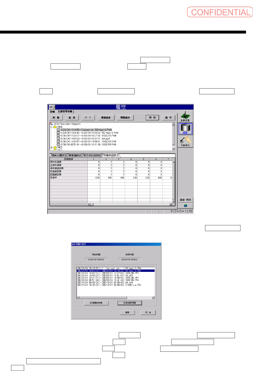 表示零件的各种错误的状况及吸着率。此表示为附属 檔群組資料 ( 文件群组资料 ) 的生产管理