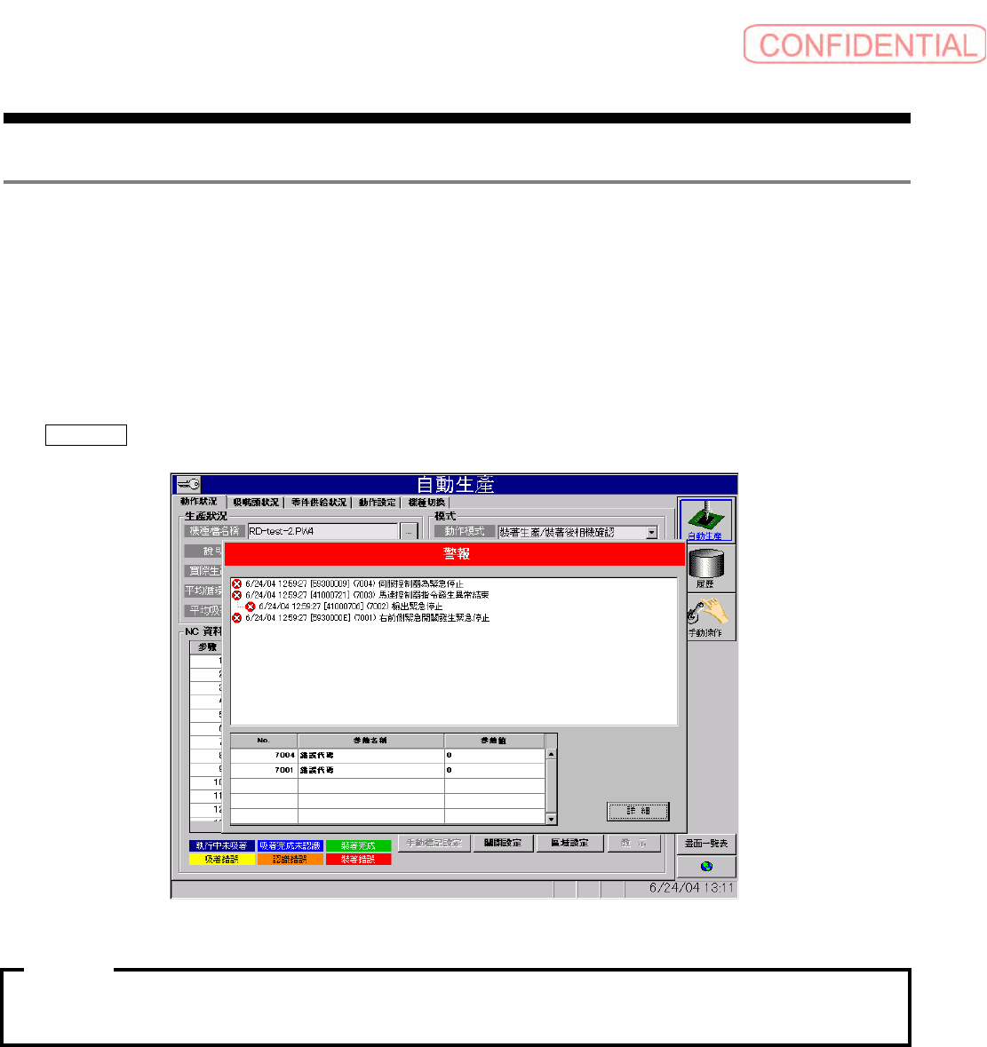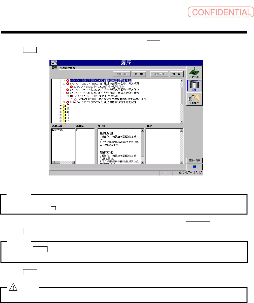 操作篇 操作篇 操作篇 操作篇 4. 自动生产 SI-F130 4-85 要想看到警报中更详 细的警报内容和处理方法, 就点击 詳細 ( 详细 ) 钮。对话框消 失,出现下 面的 警報 ( 警报 ) 画面。 图 4.8.1- 2 履歷-警 報 ( 日志-警报 ) 画面 明细的最 上行表示现在发生警报对话 框的警报信息 , 下阶层同时 表示发生关连的警报信息。 如 无表示时 ,点击 + 钮,开启资 料夹。 阅读警报说明时,点 击表示警报对…