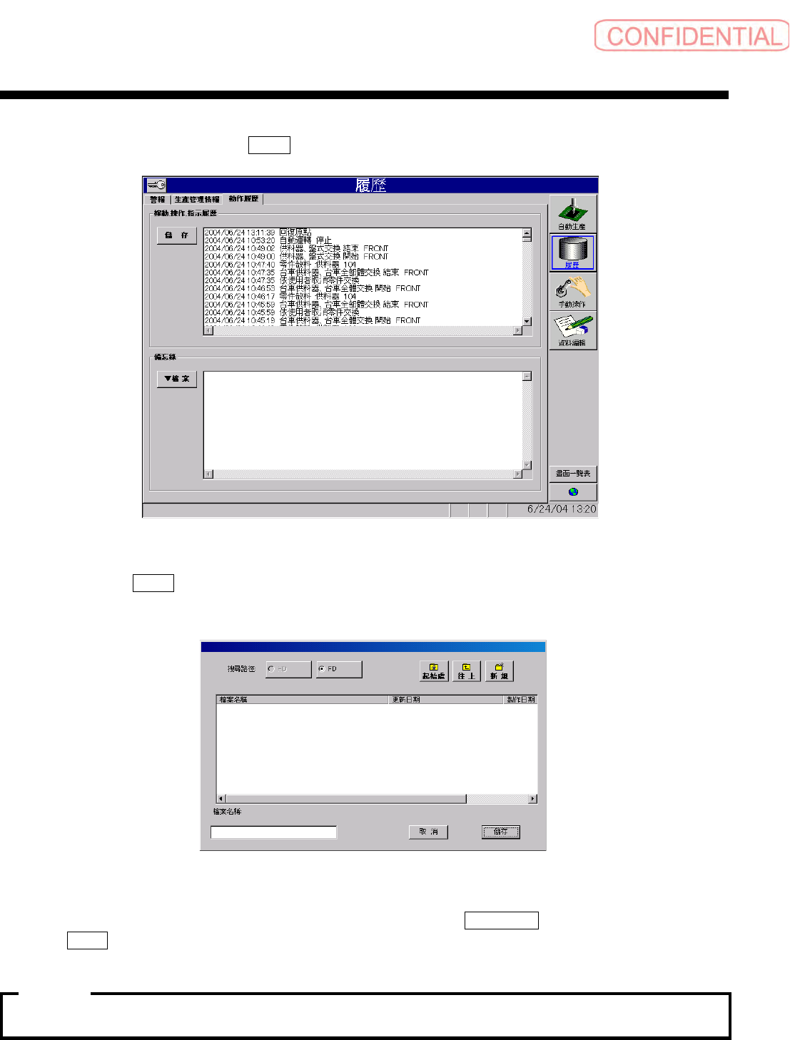 操作篇 操作篇 操作篇 操作篇 4. 自动生产 4-94 SI-F130 动作日志的储存 在存储动作日志文 件时,点击 儲存 ( 储存 ) 钮。 图 4.9-2 履歷-動作 履歷 ( 日志-动作 日志 ) 画面 会出现以下的 儲存 ( 储存 ) 对话框。 图 4.9-3 储存对话 框 存储动作日志的记 录文件并移动至存储处,输 入文件名称于 檔案名稱 ( 文件名称 ) 文本框中。 点击 儲存 ( 储存 ) 钮后,输入的 文件名称存储动作…