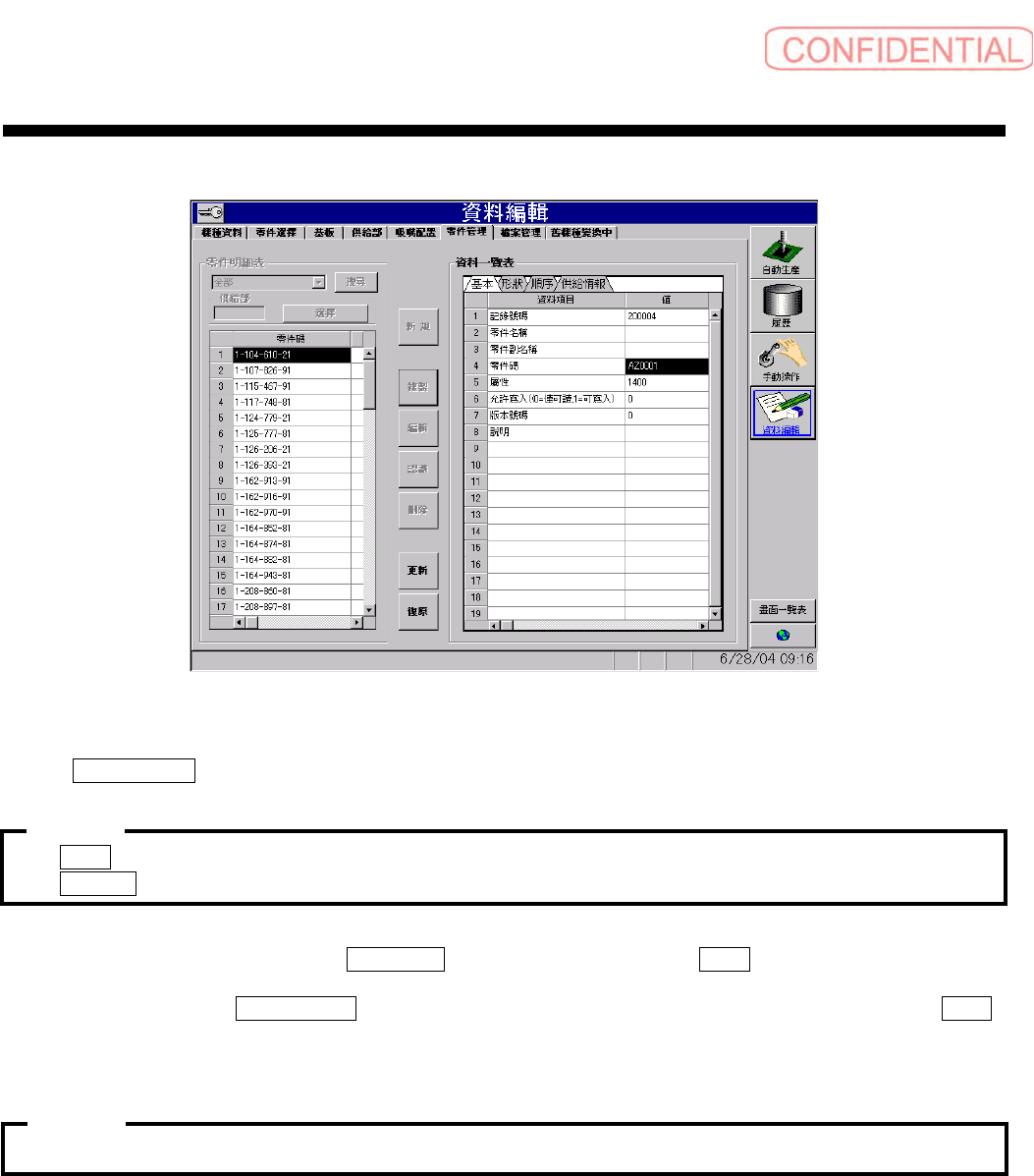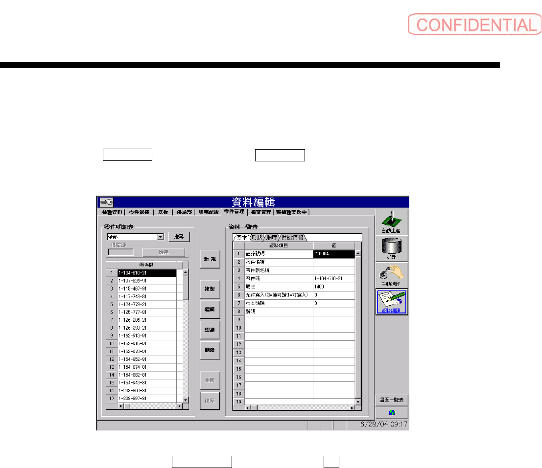 依指定顺序点击 資料編輯 ( 资料编辑 ) 菜单→ 零件管理 ( 零件管理 ),会出现以下的画面。