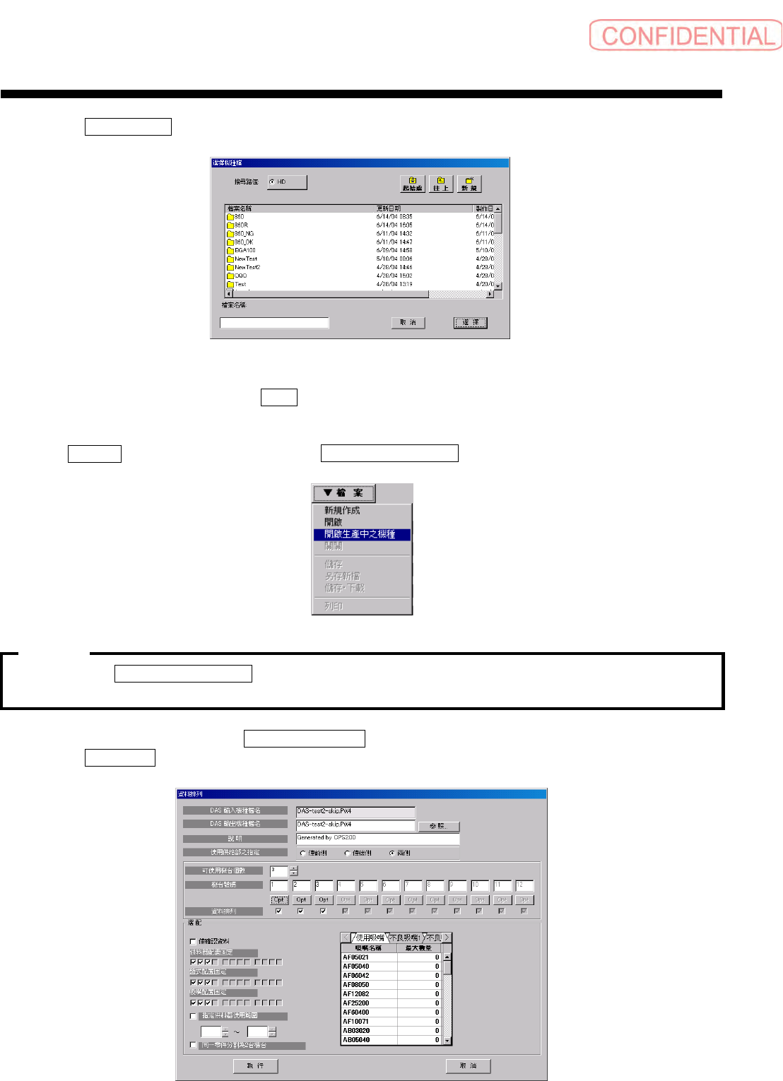 ▼檔案 ( ▼文件 ) 钮,点击菜单的 開啟生產中之機種 ( 开启生产中的机种 )。