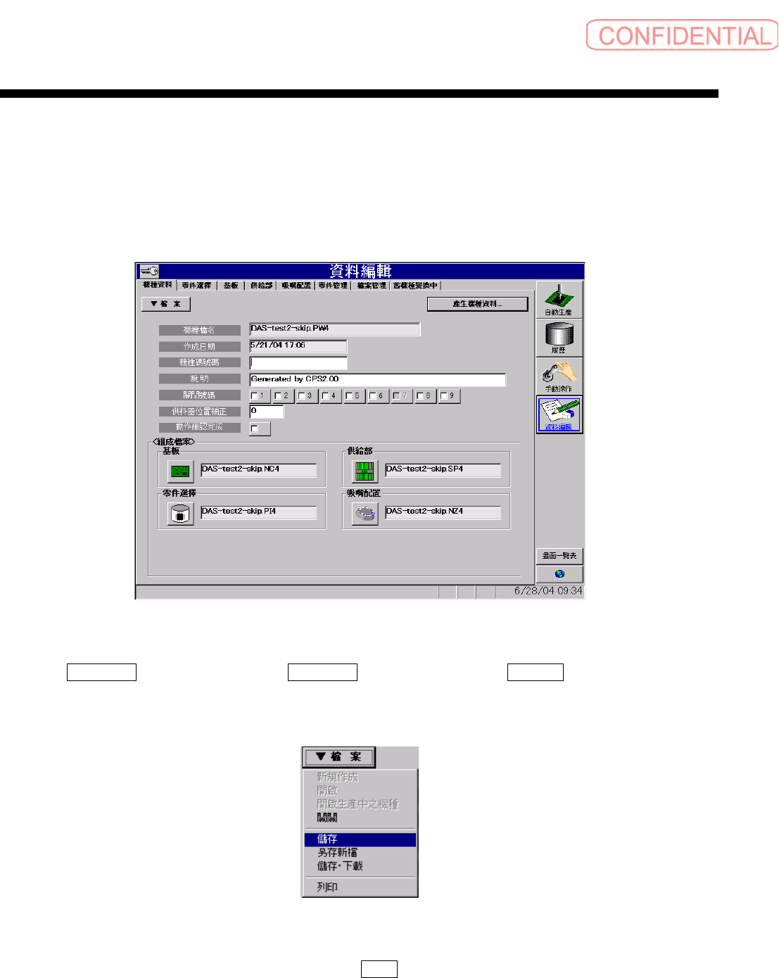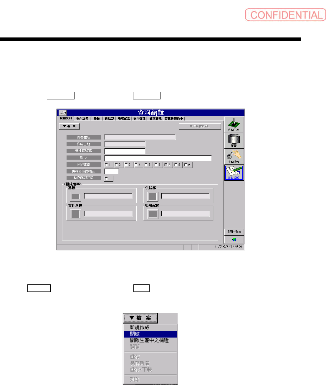 点击 資料編輯 ( 资料编辑 ) 菜单的 機種資料 ( 机种资料 ) 画面的 ▼檔案 ( ▼文件 ) 钮,会出