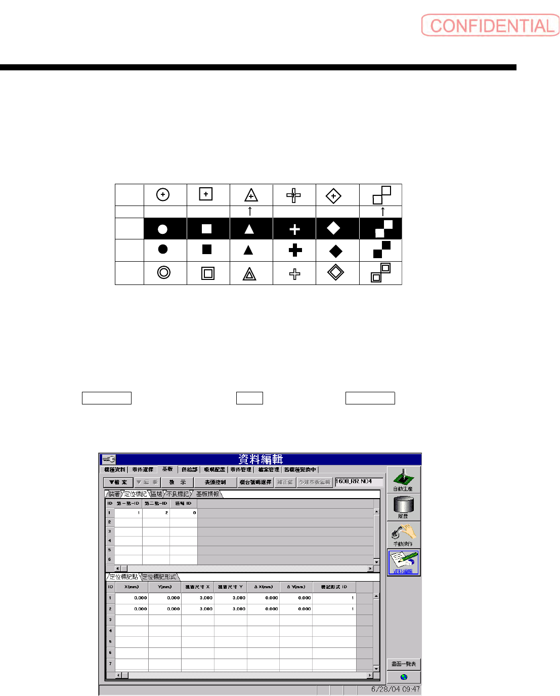 操作篇 操作篇 操作篇 操作篇 6. 资料编集 SI-F130 6-53 点击指定 定位標記形式 ( 定位标记形 式 ) 钮,会出现以下的对话框 。 图 6.4.2- 2 資料 編輯-基板 ( 资料编辑- 基板 ) 画面 指定定位标记的颜色 及形状时,点击 標記形狀 ( 标记形状 ) 钮,出现下拉 菜单后,点击定位标 记的颜色及形状的组 合。