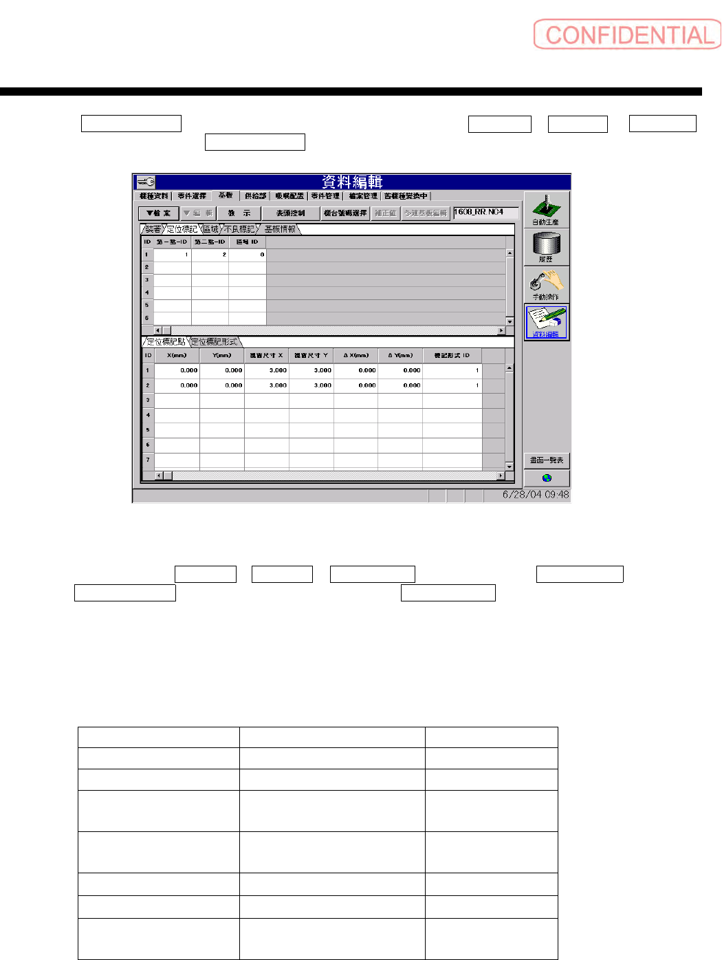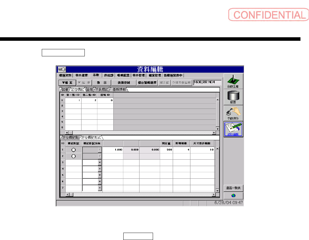 操作篇 操作篇 操作篇 操作篇 6. 资料编集 6-54 SI-F130 ·定位标记有 以下的种类。 ·新建时,登 录预设值为○。 ·△的认识坐 标位置,并非是标记中心坐 标,而是由垂直 2 等分线上 的下面 1/3 的部分。 ·正确执行移 动至定位标记位置时,需要 用步骤停止来停止自动生产 。 ·动作停止的 步骤途中,请不要执行定位 标记教示的表示,会发生系 统错误。 ·根据标记形 状的选择不同而改变输入项 目,请重新选择要改变行的 …