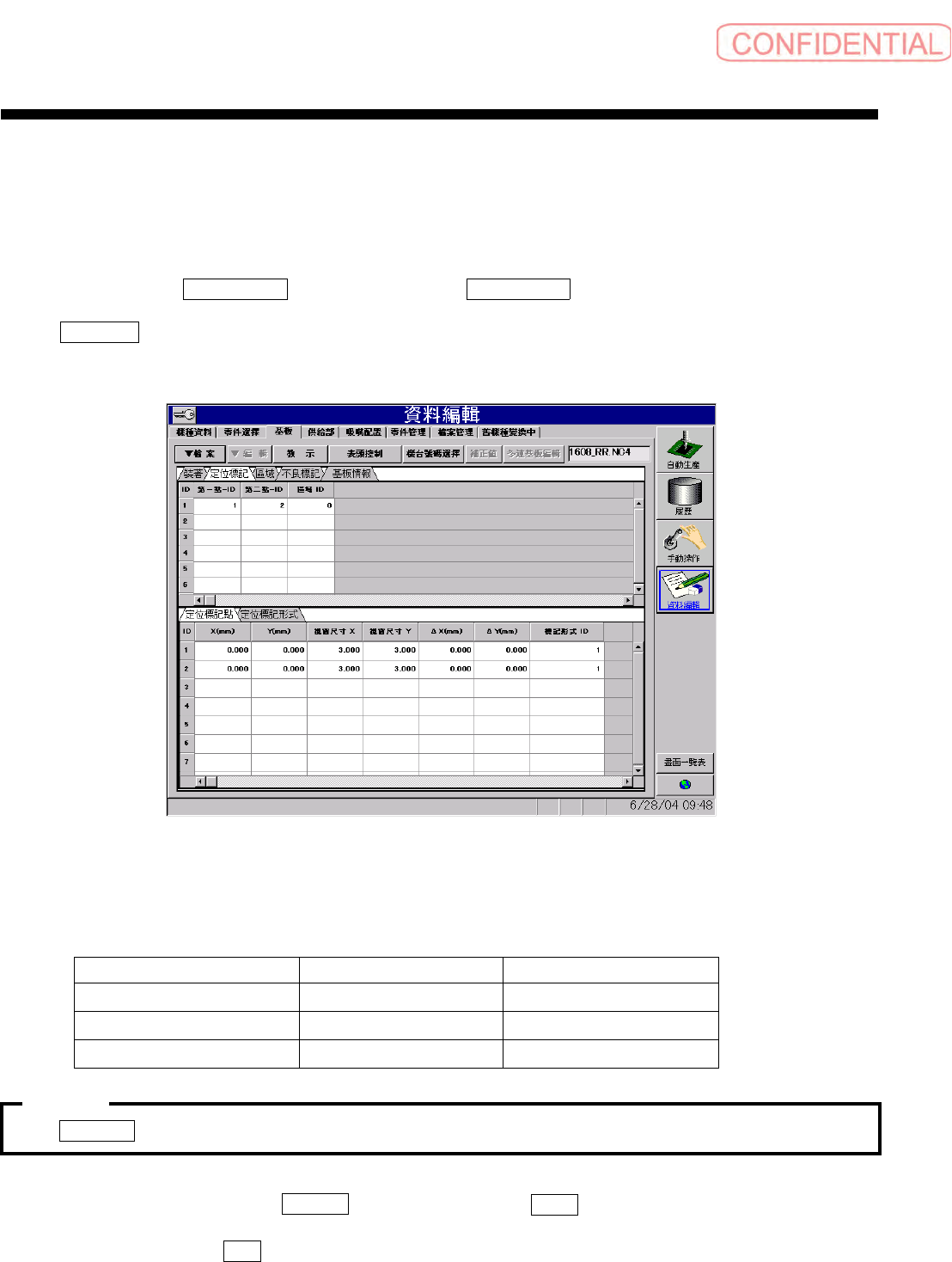 操作篇 操作篇 操作篇 操作篇 6. 资料编集 SI-F130 6-55 若指定 定位標記形式 ( 定位标记形式 ) 输入定位标 记坐标位置 X(mm) 、 Y(m m) 及 視窗尺寸 ( 视窗尺寸 ) 等,请点击 定位標記形式 ( 定位标记点 ) ,会出现以下的画面 。 图 6.4.2- 3 資料編輯- 基板 ( 资料编辑- 基板 ) 画面 在定位标记坐标位置 X(mm) 、 Y(mm) 、 視窗尺寸 X ( 视窗尺寸 X) 、 视窗…
