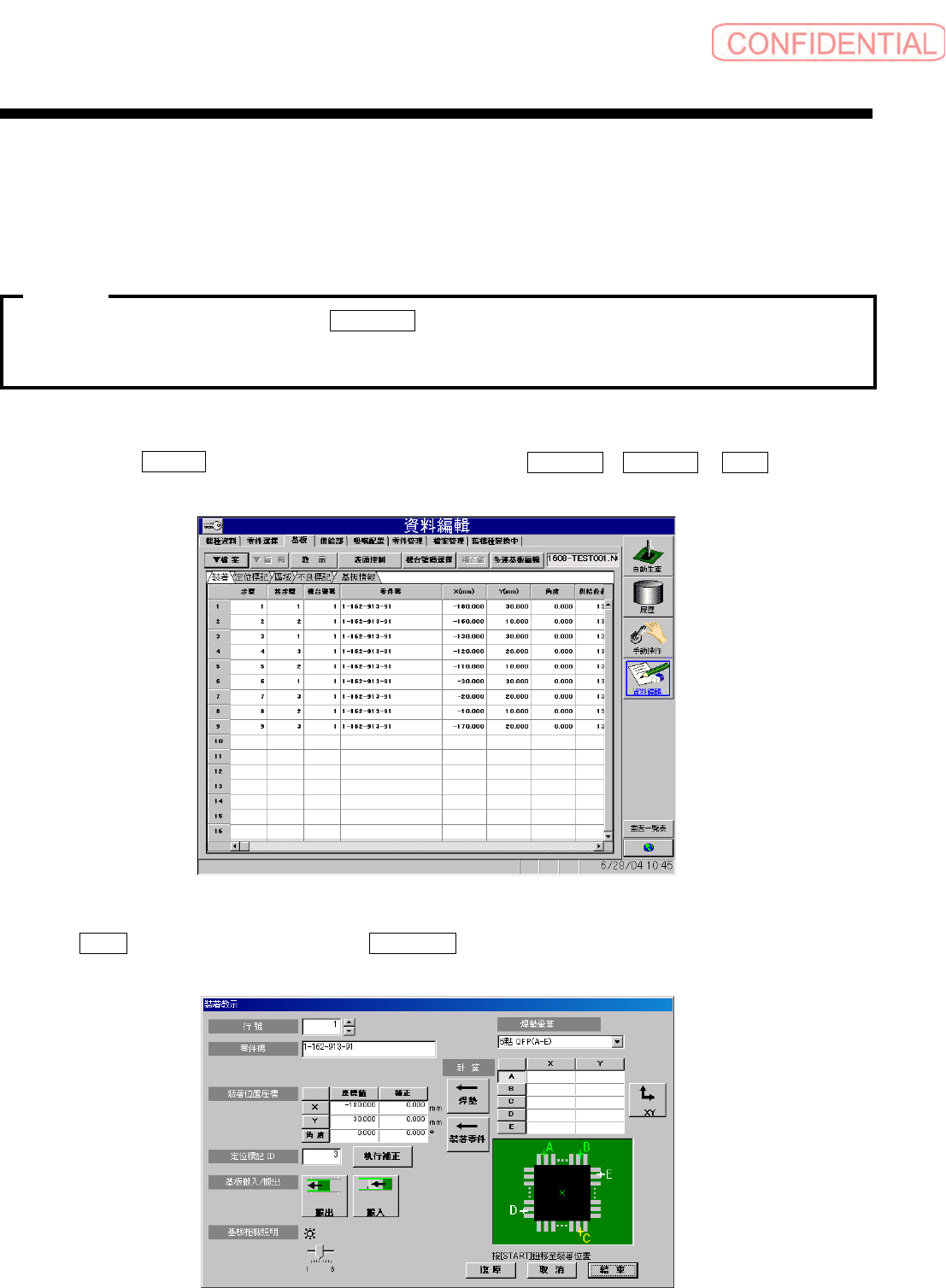 操作篇 6. 资料编集 SI-F130 6-73 區域 (区域) :取得连片基 板时,其步骤属于区域的 ID 。 因应必要的单独步 骤,由键盘输入。 不良標記 (不良标记) :取得连片基板时, 其步骤表示对应不良区域的 不良 ID 。 因应必要的单独步 骤,由键盘输入。 關閉 (关闭) :关闭号码。 装着时为 0 ,不装着时由键盘输入 7 。其它的号码则需要 时,请再输入。其它 号码请根据需要输入。 補料標幟 (补料完毕) :执行装着前…