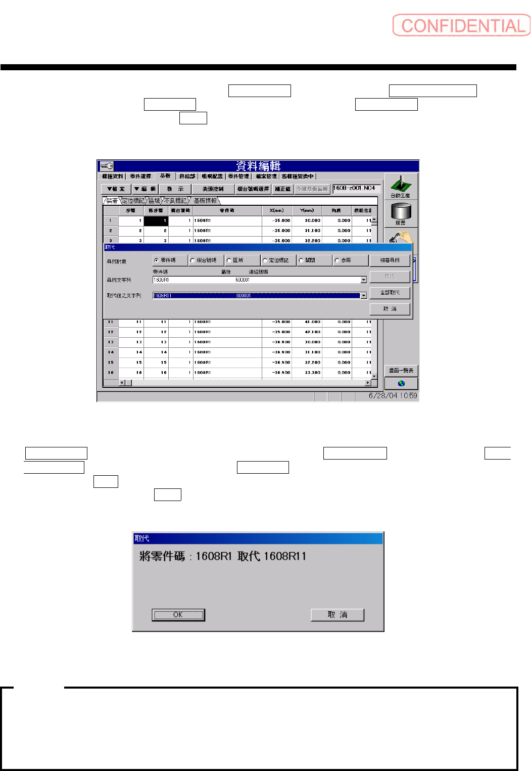 操作篇 操作篇 操作篇 操作篇 6. 资料编集 SI-F130 6-87 尋找文字列 ( ) 取代後之文 字列 ( ) 接著 尋找 ( ) 尋找文字列 ( ) 取代 ( ) 图 6.4. 5-19 資料編輯— 基板 ( 资料…