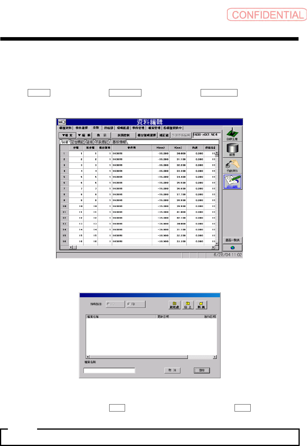 操作篇 操作篇 操作篇 操作篇 6. 资料编集 SI-F130 6-91 6.4.5. 3 参照的内容存储 [ 操作功能 ] 使用于参照的内容存 储时。 [ 操作顺序 ] 点击 ▼檔案 ( ▼文件 ) ,请 选 择 Ref. 儲存 (Ref. 储存 ) ,出 现 機種檔選擇 ( 机种文件选择 ) 对 话框。 图 6.4.5- 26 資料編輯—基板 ( 资料编辑 -基板 ) 画面 图 6.4.5- 27 选择机种文件 对话框 设定存储处及…