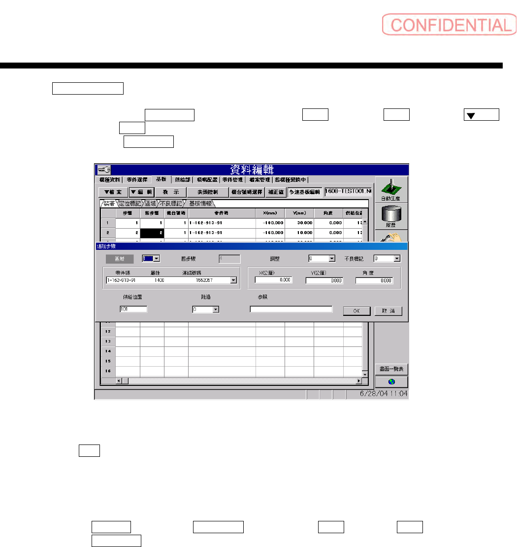操作篇 操作篇 操作篇 操作篇 6. 资料编集 SI-F130 6-93 1) 对 多連基板編輯 ( 多连基板编辑 ) 进行装着资料编辑 1.1) 步骤追 加 依指定顺序点击 資料編輯 ( 资料编辑 ) 菜单 → 基板 ( 基板 ) → 裝著 ( 装着 ) → 編輯 ( 编辑 ) → 追加 ( 追加 ) 。 会出现以下 步骤追加 对话框。 图 6.4. 5-30 追加步骤 按 OK 钮的情况下,区域的步骤 将会被追加在最后一行后面 。 …