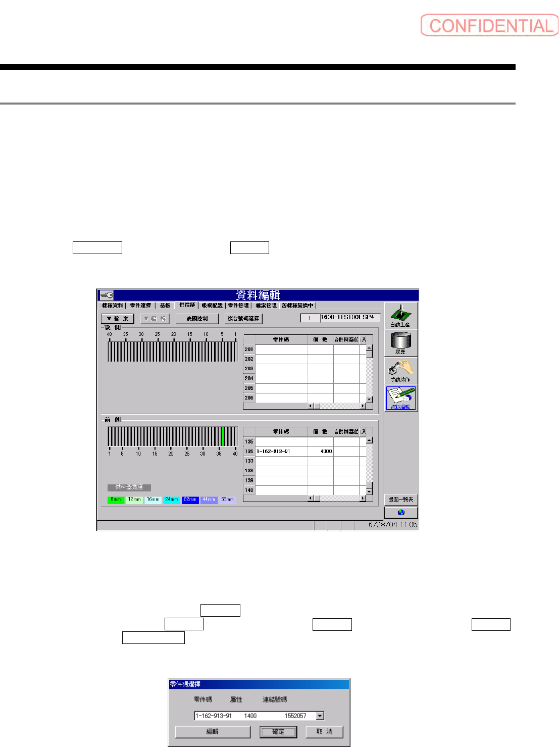 操作篇 操作篇 操作篇 操作篇 6. 资料编集 SI-F130 6-97 点击使用零件下 拉列表的 ▼ 钮, 由使 用零件选择配置的零件, 点 击 確定 ( 确定 ) 钮时, 将指定选择的零件 配 置在供给位置号 码, 对话框会 消失。 中止零件的配置 时, 请点击 取消 ( 取消 ) 钮, 零件碼選擇 ( 零件码选择 ) 对话框会消失。 删除曾经配置的 零件时, 选择 欲删除零件配置的供给位置 号码列, 点击 ▼編 輯 ( ▼编 辑 …