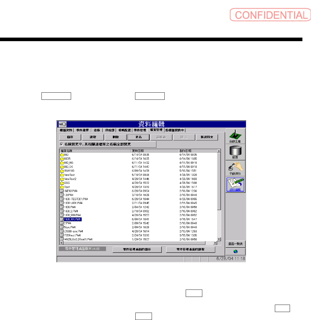 操作篇 操作篇 操作篇 操作篇 6. 资料编集 SI-F130 6-10 5 6.7.4 机种文件名 及文件夹名称的变更 机种文件名及文件夹名称的变更 机种文件名及文件夹名称的变更 机种文件名及文件夹名称的变更 [ 操作功能 ] 变更制作的机种文件 或文件夹名称。 [ 操作顺序 ] 点击指定 資料編輯 ( 资料编辑 ) 菜单的 檔案管理 ( 文件管理 ) ,会出现以 下的画面。 图 6.7.4- 1 資料編輯 —檔案管理 ( 资料编辑-…
