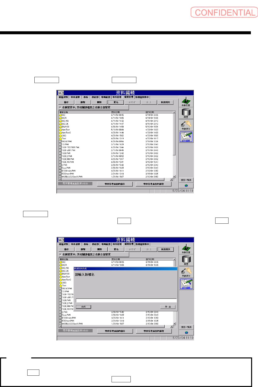 操作篇 操作篇 操作篇 操作篇 6. 资料编集 SI-F130 6-10 7 6.7.5 新资料夹的制作 [ 操作功能 ] 在机种文件夹内 制作指定的新文件夹。 [ 操作顺序 ] 点击指定 資料編輯 ( 资料编辑 ) 菜单的 檔案管理 ( 文件管理 ) ,会出现以下的画面。 图 6.7.5- 1 資料編輯 —檔案管理 ( 资料编辑-文 件管理 ) 画面 点击 新資料夾 ( 新文件夹 ) 钮时,会表示以下的对话框。 在文本框中输入欲制作的…