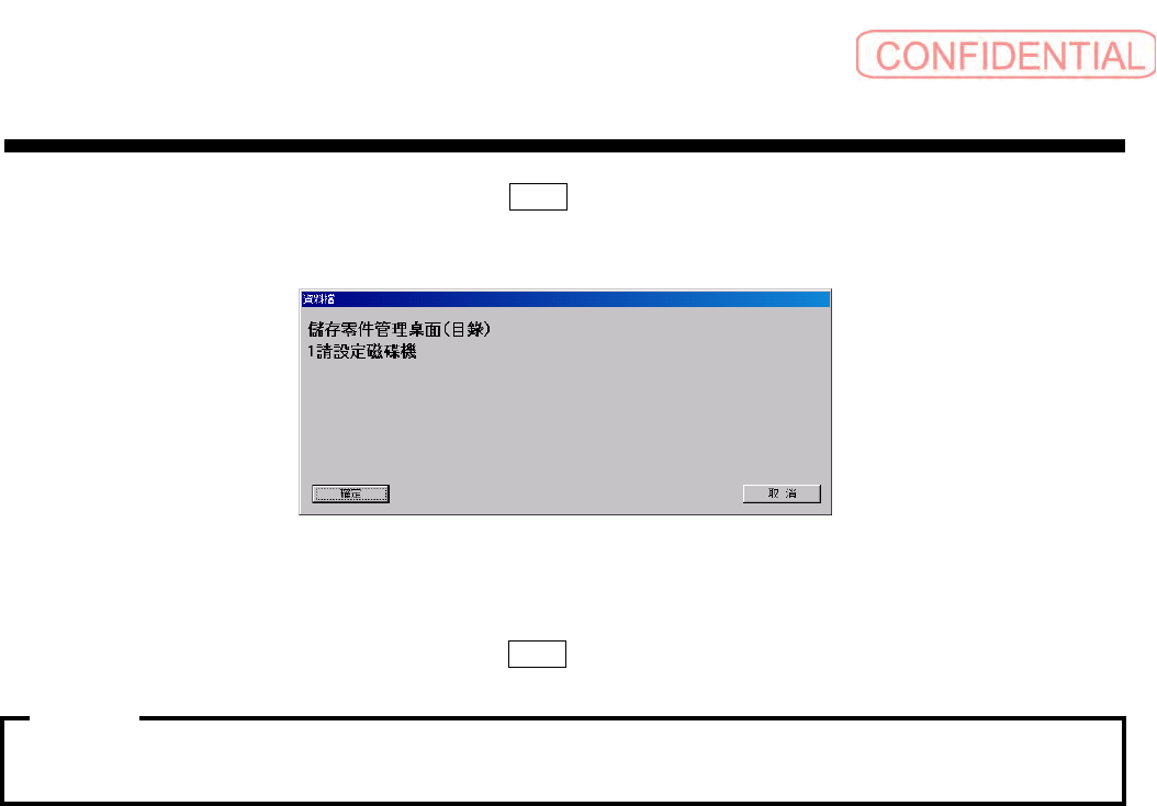 操作篇 操作篇 操作篇 操作篇 6. 资料编集 SI-F130 6-10 9 显示以下的信息对话 框,设置 FD ,点击 確定 ( 确定 ) 钮。在 FD ,零件管理表被备份。 图 6.7.6- 2 数据文件 对话框 零件管理表在 1 张 FD 里放不下时,会显示 「 請設置第 2 張 FD 。」 ( 请设置第 2 张 FD 。 ) 对 话框。请按照画面信 息,设置 FD ,点击 確定 ( 确定 ) 钮。 ·在零件管理 表储存中,显示 …