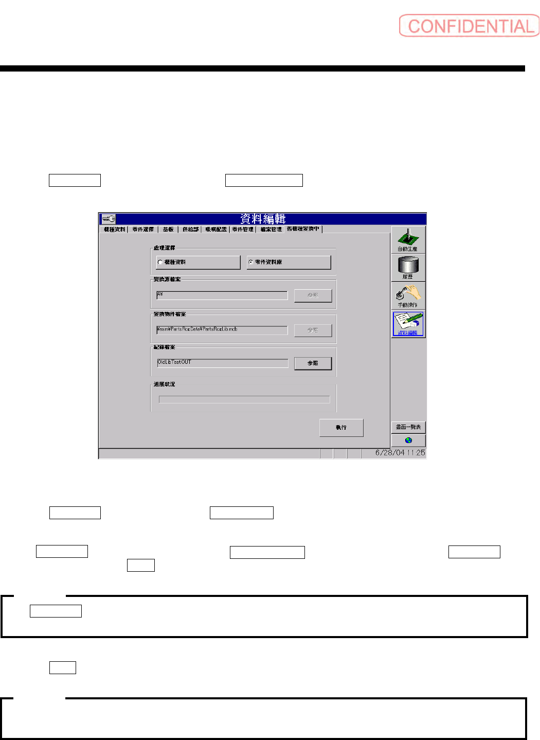 操作篇 操作篇 操作篇 操作篇 6. 资料编集 SI-F130 6-1 15 6.8.2 从旧机种零 件数据库开始的变换 从旧机种零件数据库开始的变换 从旧机种零件数据库开始的变换 从旧机种零件数据库开始的变换 [ 操作功能 ] 将旧机种的零件数据 库所使用的零件数据,在零 件管理表中变换为本机种能 够使用的零件管理表 并登录。 [ 操作顺序 ] 点击 資料編輯 ( 资料编辑 ) 菜单的 → 舊機種變 換中 ( 旧机种变换中 ) ,会出…