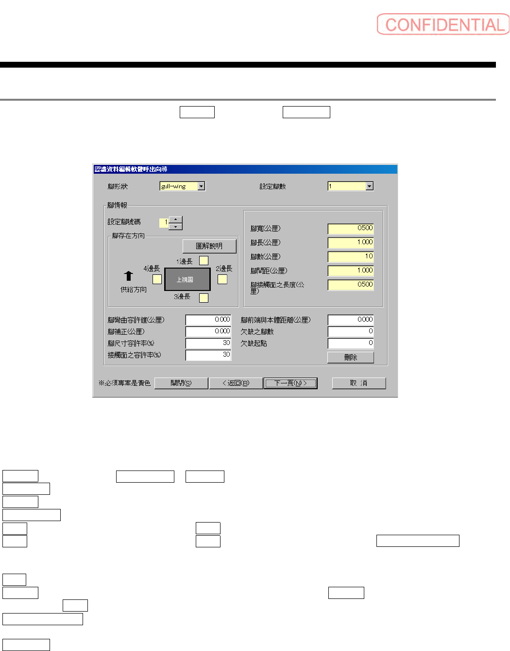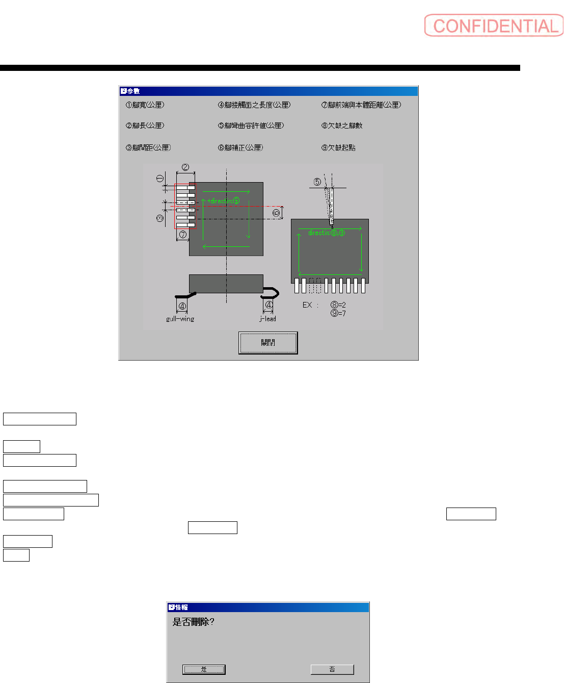 零件认识资料制作篇 零件认识资料制作篇 零件认识资料制作篇 零件认识资料制作篇 第 1 章 操作 1-8 SI-F130/SI-F 209 图 2.2-2 腳參數 ( 脚参数 ) 腳彎曲容許值 ( 脚弯曲容许 值 ) :设定被指定 的一组脚的脚宽度方向的弯 曲容许值。不能不满 0 ,在 0.001 ~ 10 之间,设定为 0 时,不进行 确认。 腳補正 ( 脚补正 ) :设定被指定的一组脚的宽 度方向的中心与本体中心位 置的补正值。 腳…