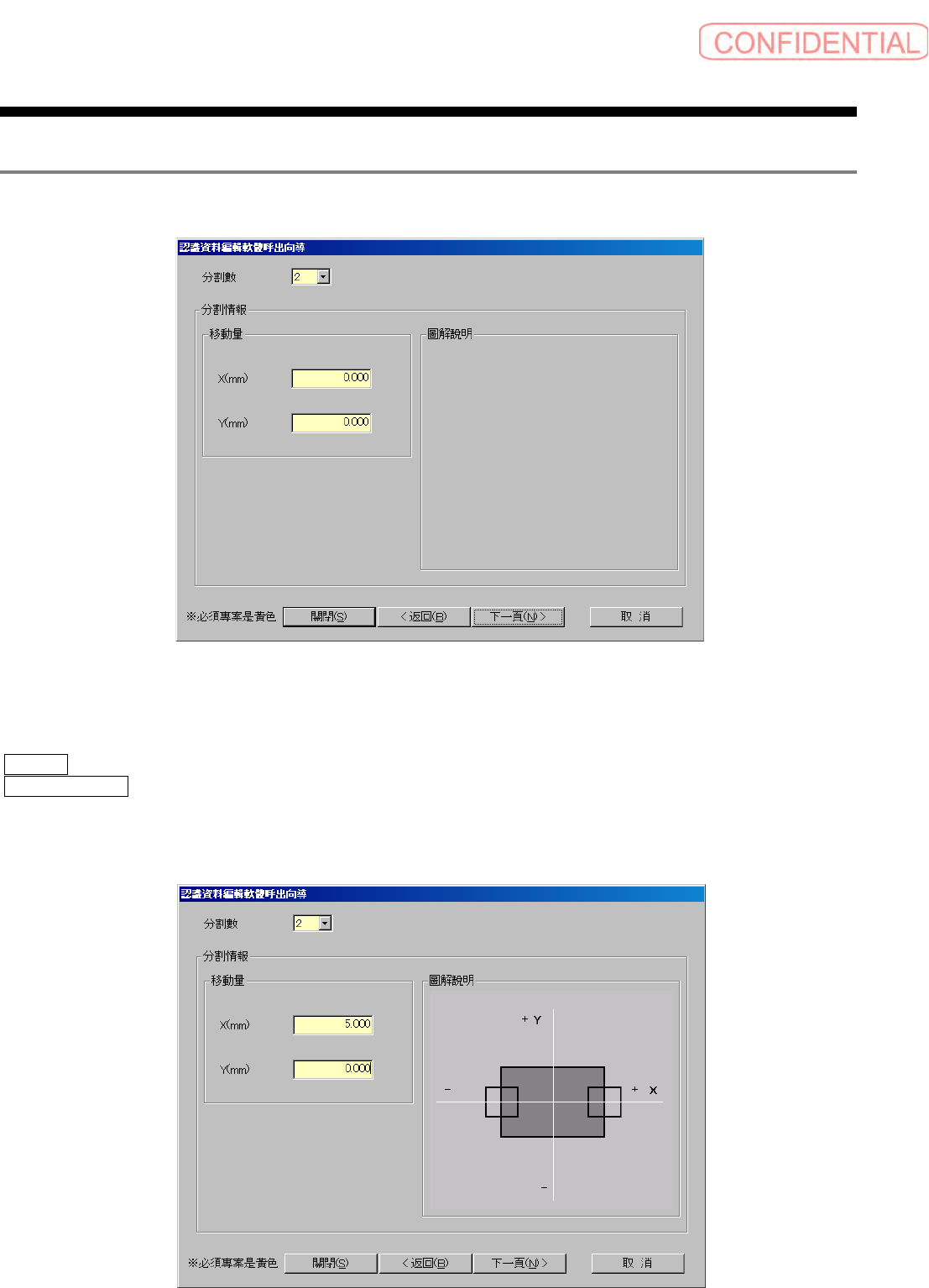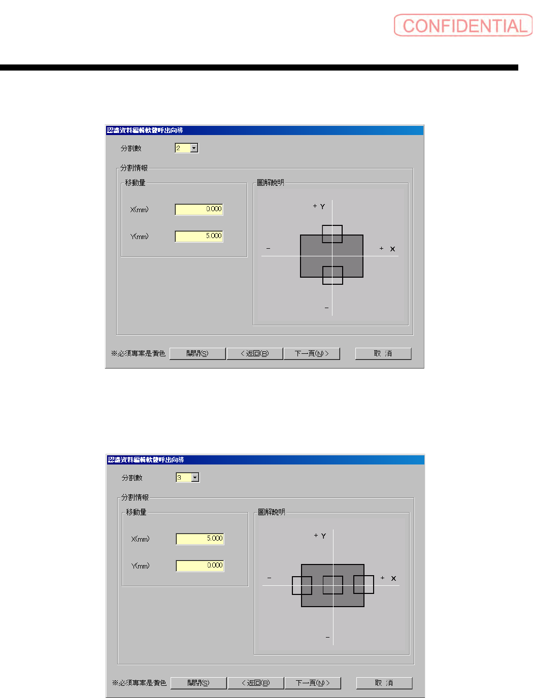 零件认识资料制作篇 零件认识资料制作篇 零件认识资料制作篇 零件认识资料制作篇 第 1 章 操作 1-10 SI-F130/SI-F 209 2.4 分割信息输入画面 分割信息输入 画面 分割信息输入 画面 分割信息输入 画面 基本信息输入画面 上,分割被确认后显示。 图 2.4.- 1 分割情報 ( 分割信息 ) 输入 画面 在成为必须项目的 黄色区域内输入值。 分割數 ( 分割数 ) : 2 ~ 4 中选择。 移動量 X 、 Y (…