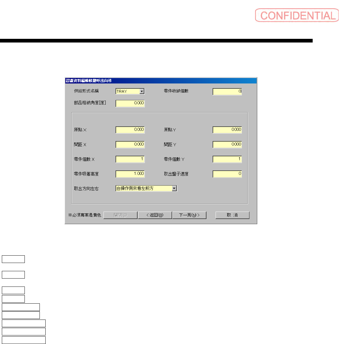 零件认识资料制作篇 零件认识资料制作篇 零件认识资料制作篇 零件认识资料制作篇 第 1 章 操作 1-16 SI-F130/SI-F 209 2.5.4 供给形式名称是 供给形式名称是 供给形式名称是 供给形式名称是 TRA Y 时( 仅 时( 仅 时( 仅 时( 仅 SI-F209 ) ) ) ) 图 2.5-4 供给信息输 入 画面 TRA Y 原點 X ( 原点 X) :盘式零件的 X 方向 的前头供给位置。从盘子的供给门 看,以…