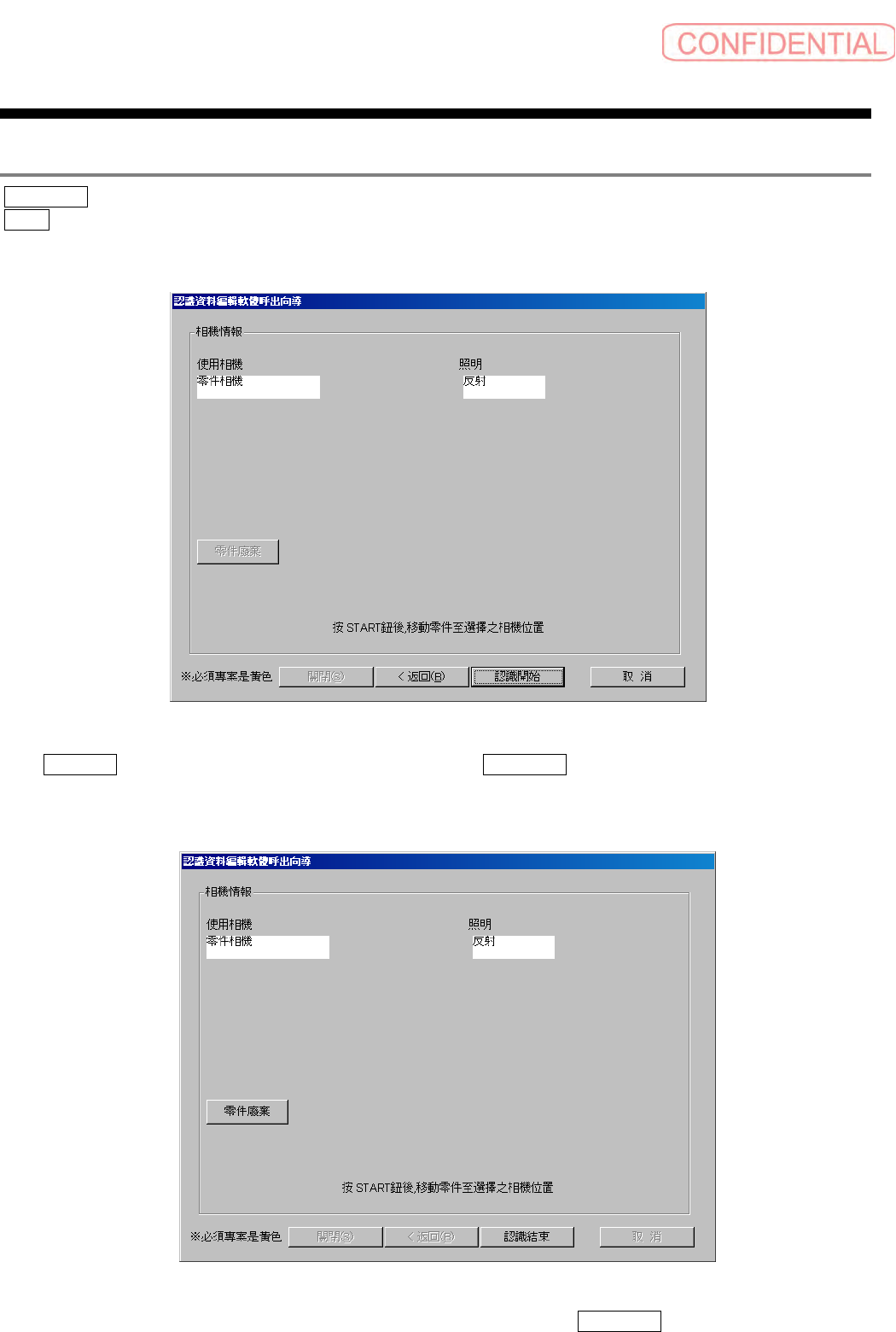 按下 START 钮,零件向被选择的相机移动之后,点击 認識開始 ( 认识开始 ) 钮,调出认识资料编