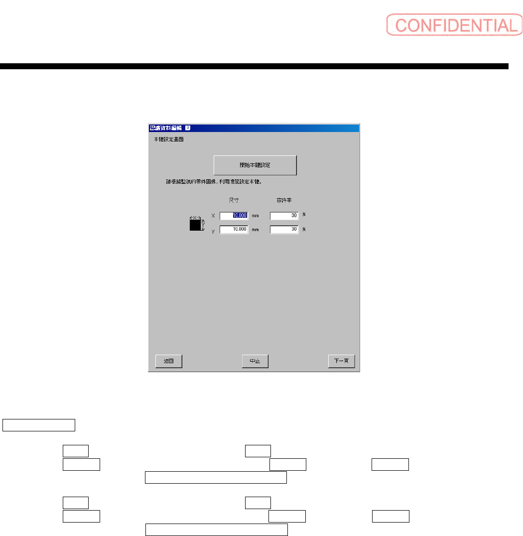 零件认识资料制作篇 零件认识资料制作篇 零件认识资料制作篇 零件认识资料制作篇 第 1 章 操作 1-30 SI-F130/SI-F 209 3.4.2 脚零件的半自动生成画面 脚零件的半自动生成画面 脚零件的半自动生成画面 脚零件的半自动生成画面 图 3.4.2 脚零件的半 自动生成 画面 電極位置的設定 ( 电极位置的设定 ) - 追加 ( 追加 ) : 将为了特别指定影像上显示 的电极位置点追 加到零件监视上。 按下 追加 ( 追…