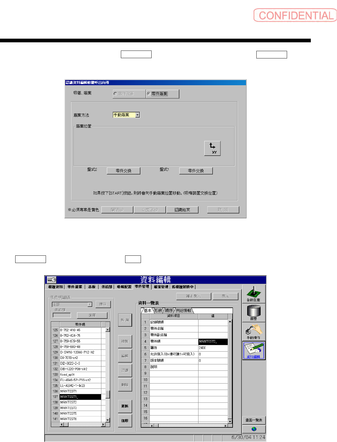 为了将认识的零件从吸嘴上取下,执行 零件廢棄 ( 零件废弃 ),取下零件后,点击 認識結束 ( 认识