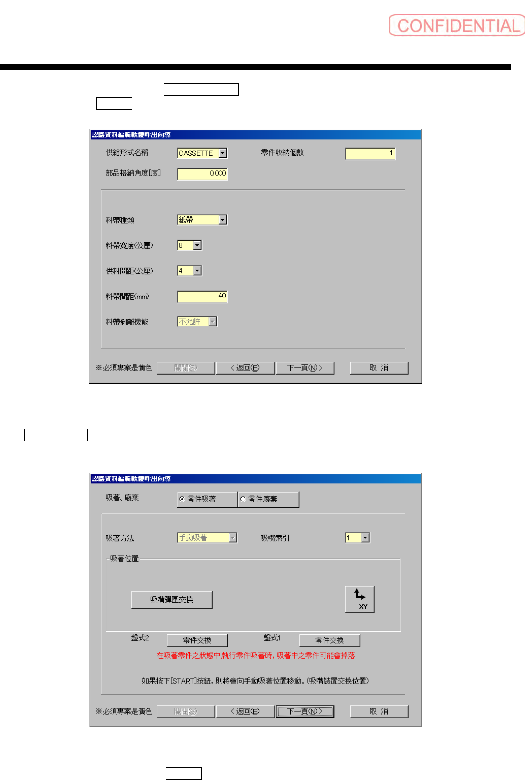 零件认识资料制作篇 零件认识资料制作篇 零件认识资料制作篇 零件认识资料制作篇 第 2 章 顺序 SI-F130/SI-F 209 2-29 显示供给部信息输入 画面,选择 供給形式名稱 ( 供给形式名称 ) ,设定适当的信息。 输入结束后,点击 下一頁 ( 下一 页 ) 。 图 1.5-4 供给部信息输 入 画面 显示 吸著、廢棄 ( 吸着、废弃 ) 画面 ( 此处是手动吸着 ) ,所以选择吸 着的吸嘴,按 ST AR T 钮, 请将…