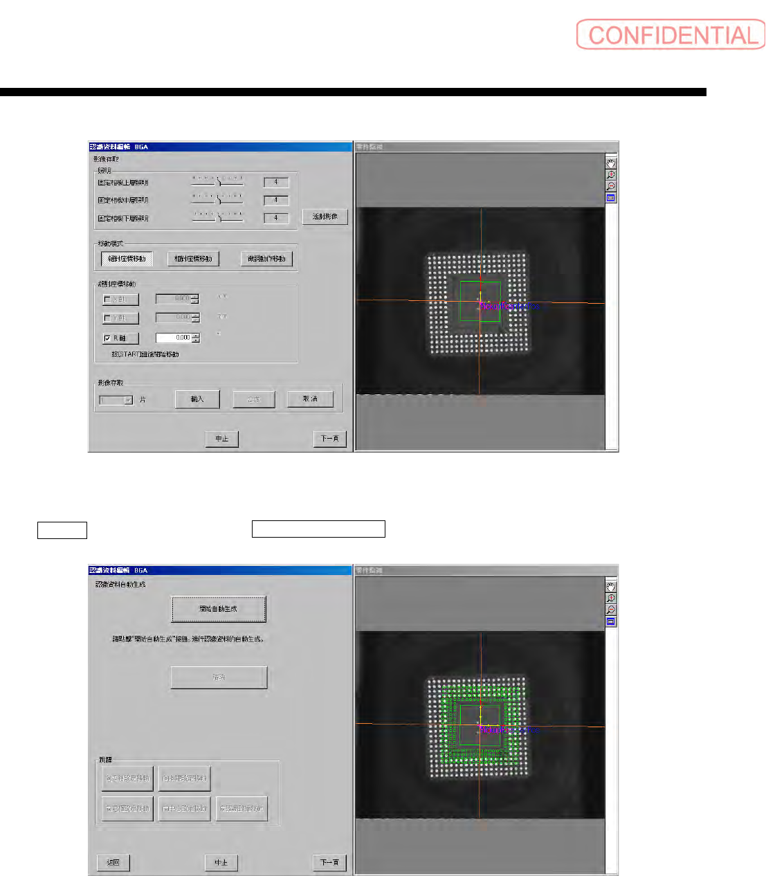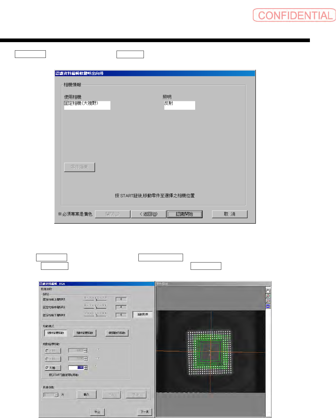 零件认识资料制作篇 零件认识资料制作篇 零件认识资料制作篇 零件认识资料制作篇 第 2 章 顺序 SI-F130/SI-F 209 2-31 图 1.5-8 認識資料編 輯 ( 认识资料 编辑 ) -锡球信息 未输入时 首先,点击 影像存取 ( 影像存取 ) 的 輸入 ( 输入 ) 钮,存取零件的 透射影像。 图 1.5-9 影像存取 ( 影像存取 ) 后-锡球 信息输入时